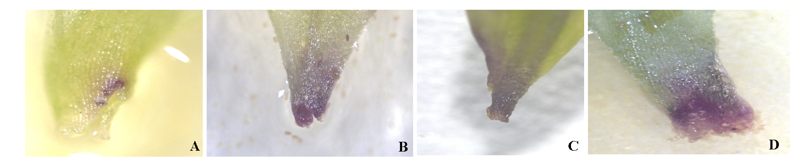 图10 江南牡丹草柱头可授性变化 A:散粉前期;B:散粉初期;C:散粉中期;D:散粉末期。