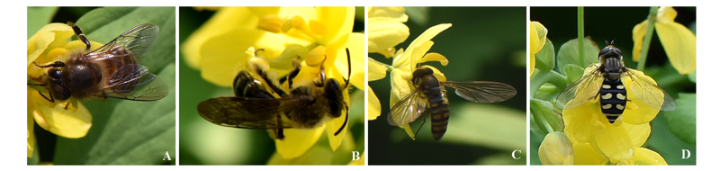 Fig. 12 The species of flower-visiting insect of Gymnospermium kiangnanense A:Apis cerana;B:Halictussp.;C:Episyrphus balteatus;D:Scaeva pyrastri.