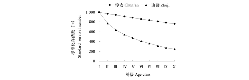 表1 江南牡丹草淳安种群和诸暨种群静态生命表