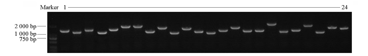 图3 初级文库24个克隆中插入片段PCR鉴定 Marker是DL2000;1 ~ 24为PCR 样品。