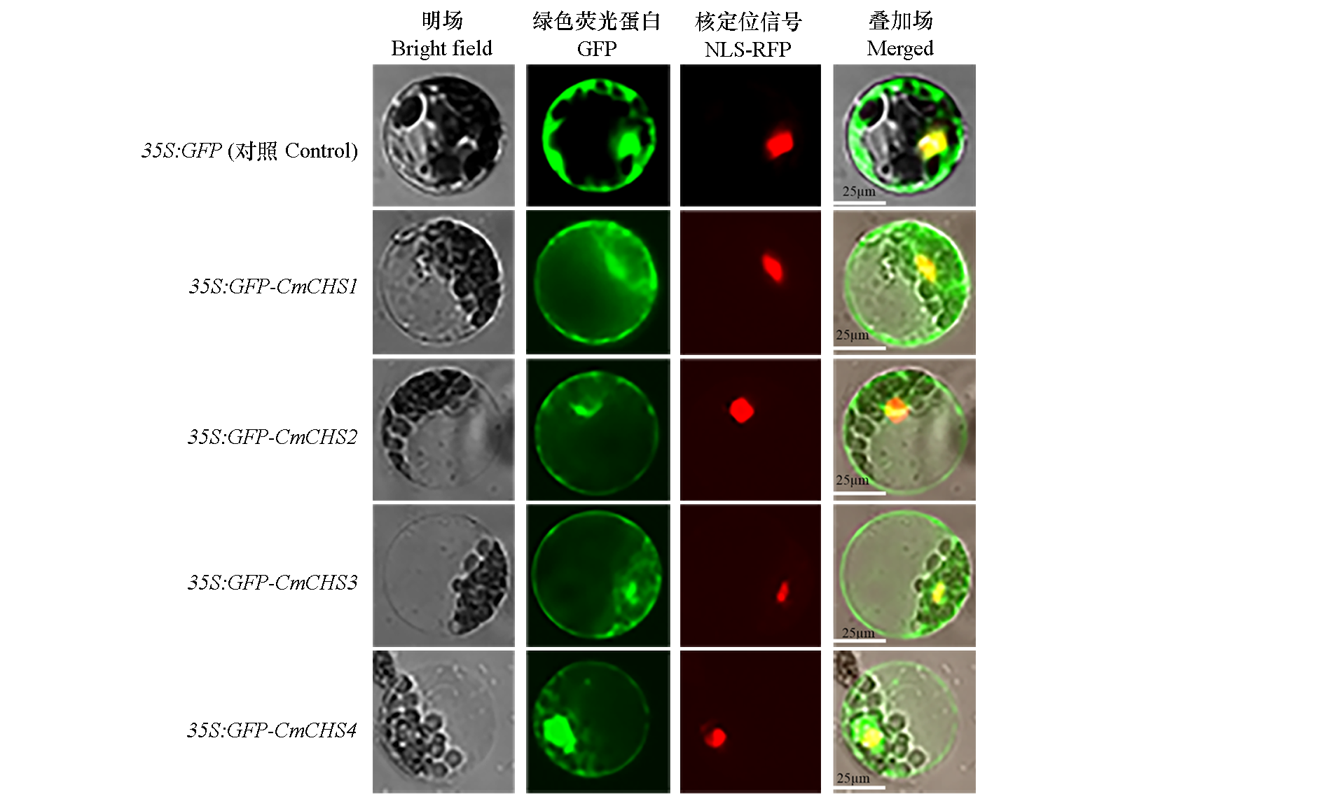 图3 CmCHS 亚细胞定位结果 将4个重组质粒瞬时转染到野生型拟南芥原生质体中,在室温黑暗中培养21 h。激光扫描共聚焦显微镜捕获荧光蛋白。