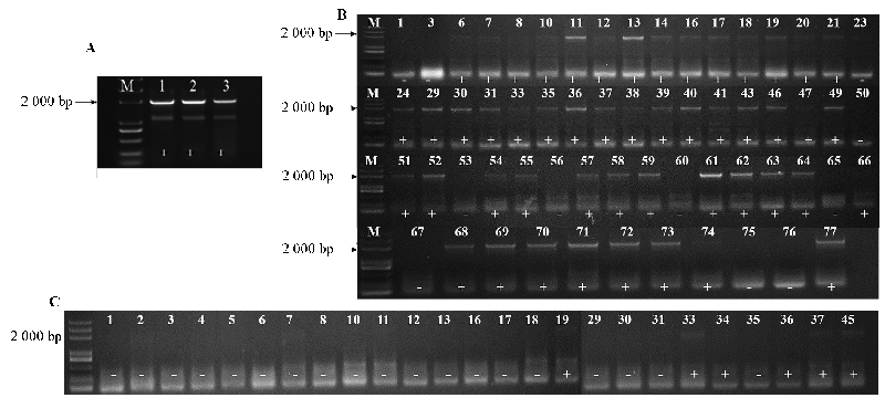 Fig. 3 Amplification results of SCF27-2000 marker in hybrid progeny of three different cross-combinations M:2 000 Plus marker;A:There were 3 hybrid progeny detected in‘Sultanina Rose’בRuby Seedless’;B:There were 61 hybrid progeny detected in‘Ruby Seedless’ב Beibinghong’;C:There were 25 hybrid progeny detected in‘Ruby Seedless’בZuoyouhong’.