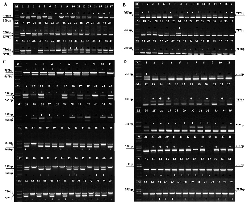 Fig. 4 Amplification results of GSLP1-569 and S241-717 in 49 and 75 hybrid progeny of‘Flame Seedless’בZuoyouhong’(A,B)and‘Flame Seedless’בBeibinghong’(C,D) M:2 000 Plus marker.