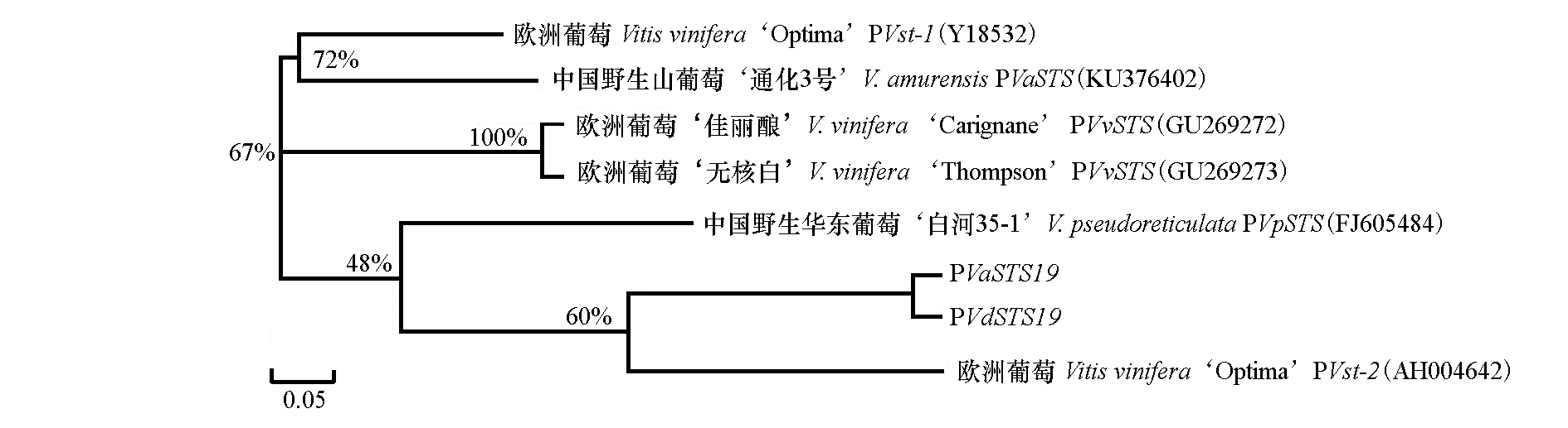 Fig. 6 A phylogenetic tree based on a ClustalX multiple sequence alignment of STS promoters from a range of grape species The scale bar represents 0.05 substitutions per site and the numbers next to the nodes are bootstrap values from 1 000 replicates.