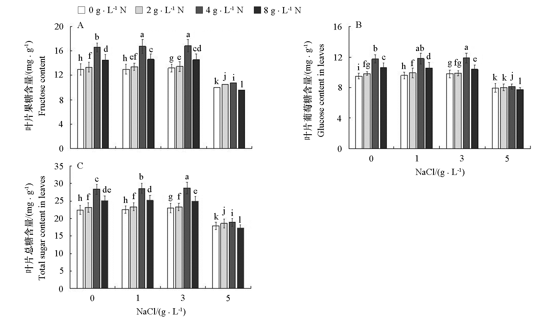 图1 不同浓度盐和氮处理下叶片和果实中的氮含量 柱形图上不同小写字母表示处理间在0.05水平差异显著(P < 0.05)。下同。