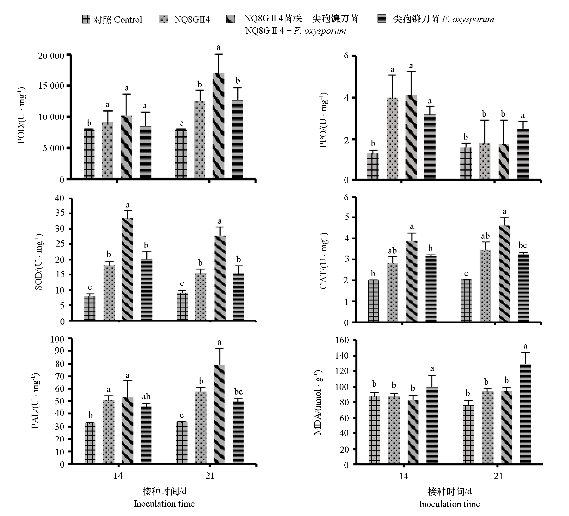 Fig. 4 Effect of NQ8GⅡ4 on defence enzyme activity and MDA content of Chinese wolfberry inoculated with Fusarium oxysporum Different lowercase letters indicate significant differences among different treatments at 0.05 level.