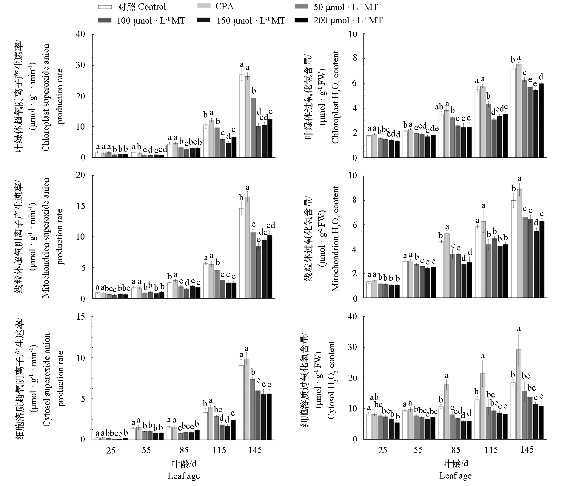 图1 褪黑素(MT)及其合成抑制剂(CPA)对葡萄叶片衰老过程中各亚细胞组分中活性氧水平的影响 不同小写字母表示同一时期不同处理间差异显著(P < 0.05)。下同。
