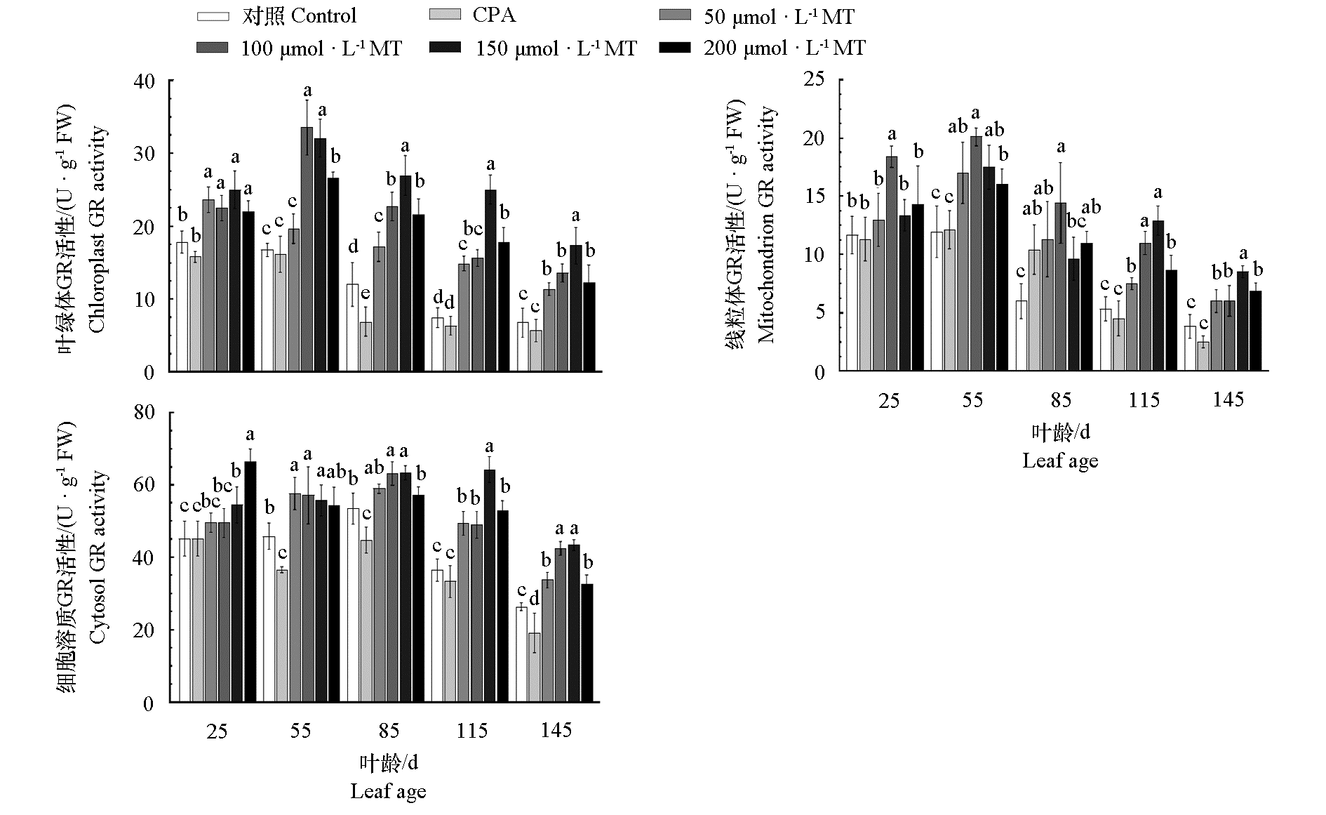 图6 褪黑素(MT)及其合成抑制剂(CPA)对葡萄叶片衰老过程中各亚细胞组分中GR活性的影响