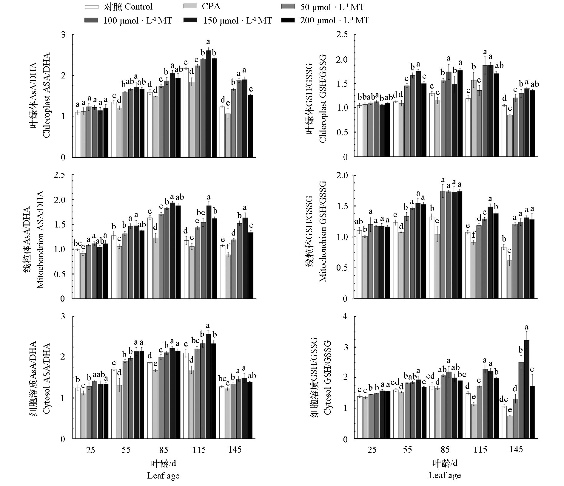 图9 褪黑素(MT)及其合成抑制剂(CPA)对葡萄叶片衰老过程中各亚细胞组分中AsA/DHA和GSH/GSSG的影响