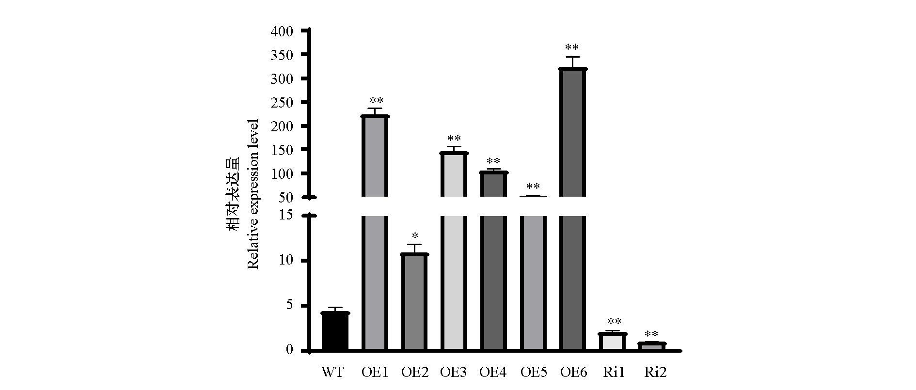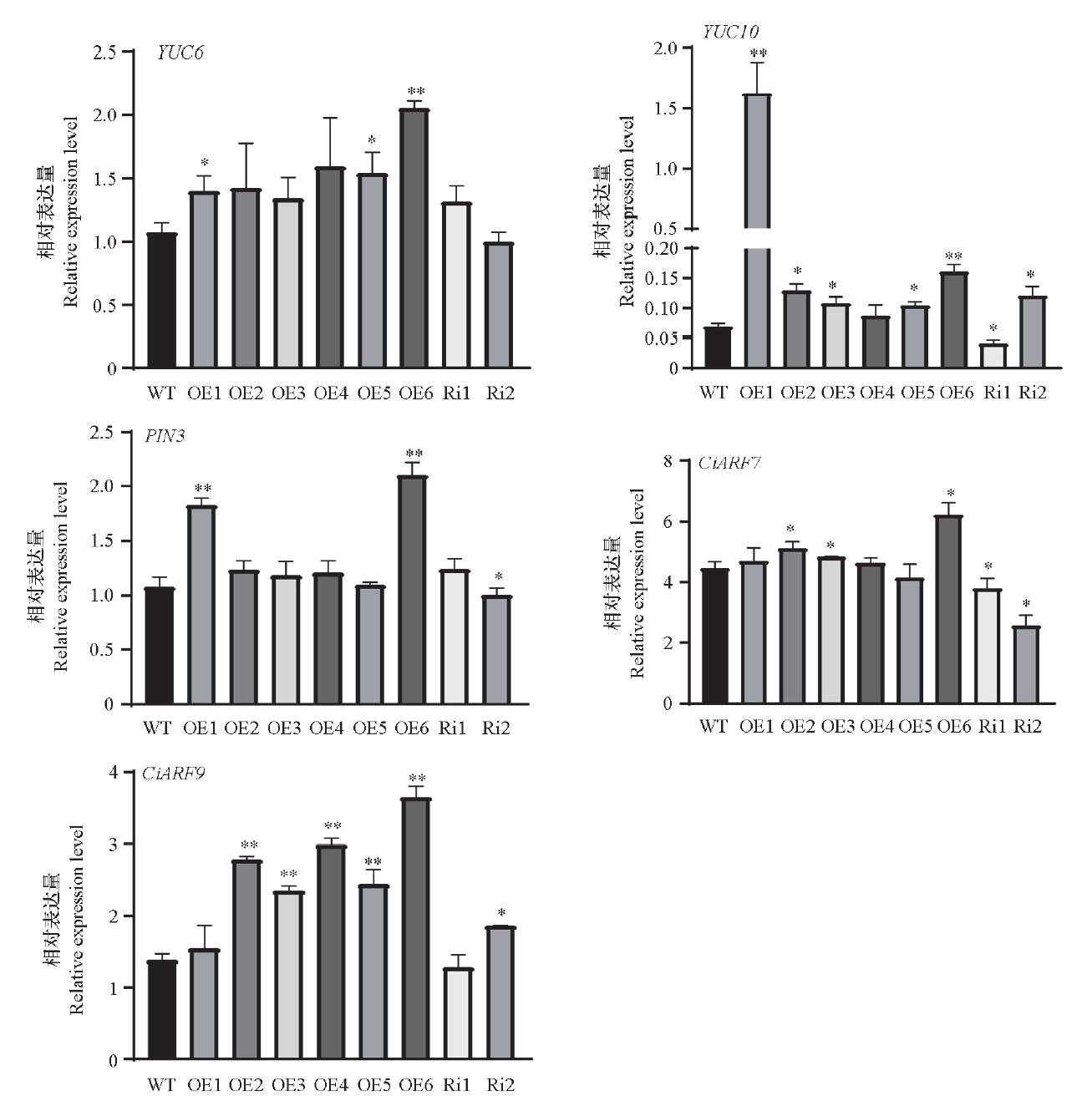 图8 柑橘CclSAUR49过量表达(OE)和干扰表达(Ri)及野生型(WT)植株叶片中类柠檬苦素相关基因的表达量