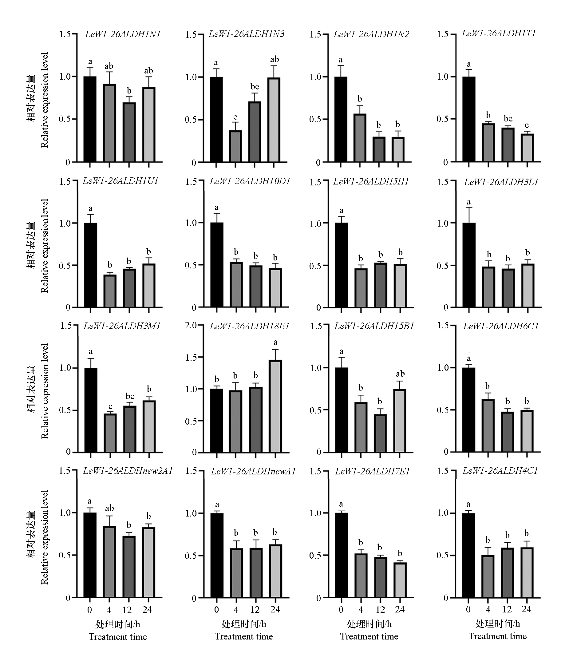 Fig. 4 The gene expression levels of ALDH gene family in S606 strain were detected by qRT-PCR after different time periods of heat stress at 40 ℃ Different lowercase letters indicate significant differences between groups(P < 0.05).