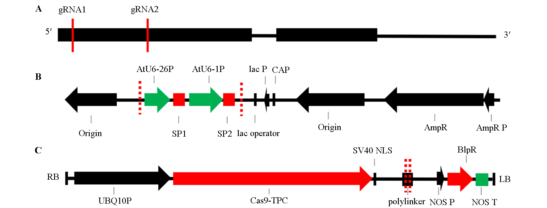 Fig. 1 Schematic diagram of CsCOL5 gene and target in cucumber A:The black boxes and lines represent exons and non-coding regions,respectively. The red vertical bars indicate the target location and the gRNAs name of the design. B,C:Carrier diagram. The red dotted line in B was cut off with endonucliase and transferred to the polylinker of C.