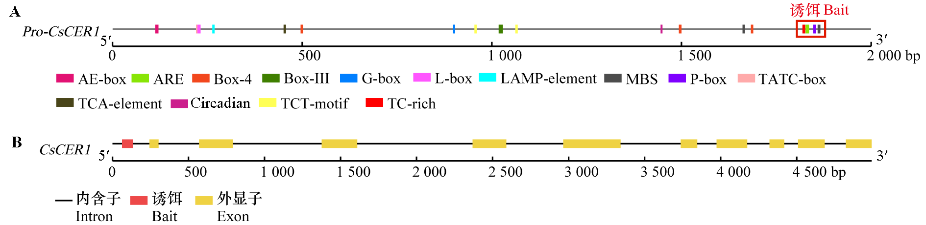 图2 CsCER1的启动子顺式作用元件分布位置(A)及诱饵选择(B) 启动子元件包括:厌氧诱导(ARE)、光响应相关元件(AE-box、Box-4、TCT-motif、G-box、L-box、LAMP-element),蛋白结合位点(Box-III),MYB参与干旱诱导的结合位点元件(MBS),赤霉素响应(P-box、TATC-box),参与防御和应激反应(TC-rich),水杨酸反应(TCA-element),昼夜节律控制元件(Circadian)。