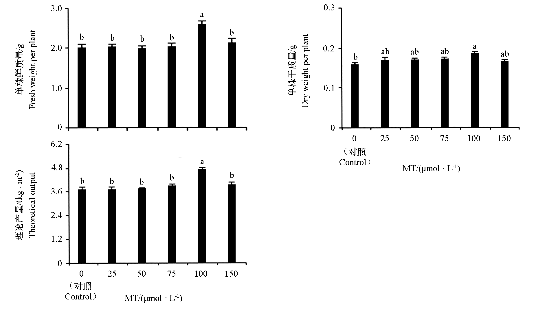 Fig. 2 Effects of different concentrations of melatonin(MT)on the dry weight,fresh weight,theoretical output of hydroponic Chinese chives Different lowercase letters on the column indicate significant differences between treatments(P < 0.05). The same below.