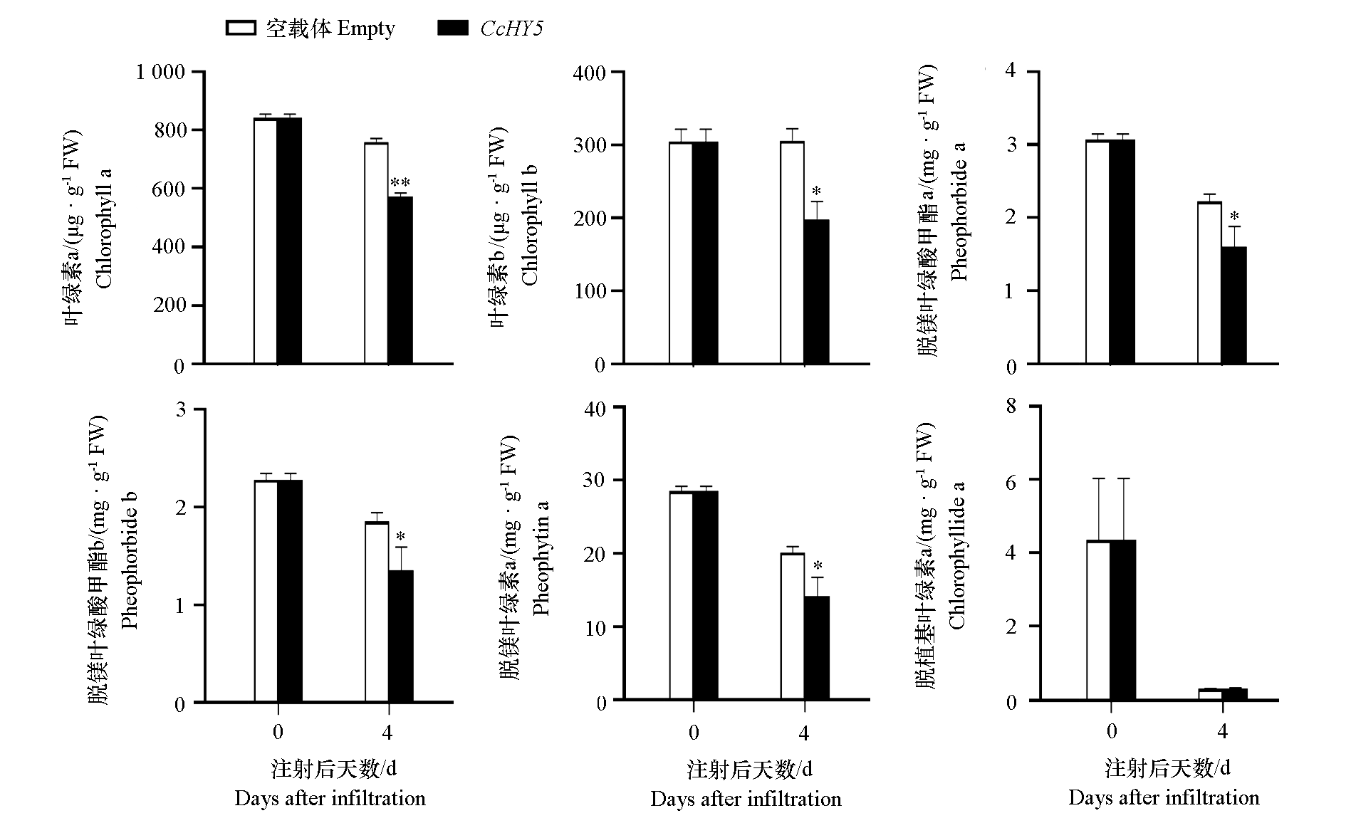 Fig. 11 Effects of transient overexpression of CcHY5 on the content of chlorophyll and its metabolites in the peel of mandarin fruit(25 ℃) Student’s t-test,* α = 0.05,** α = 0.01.