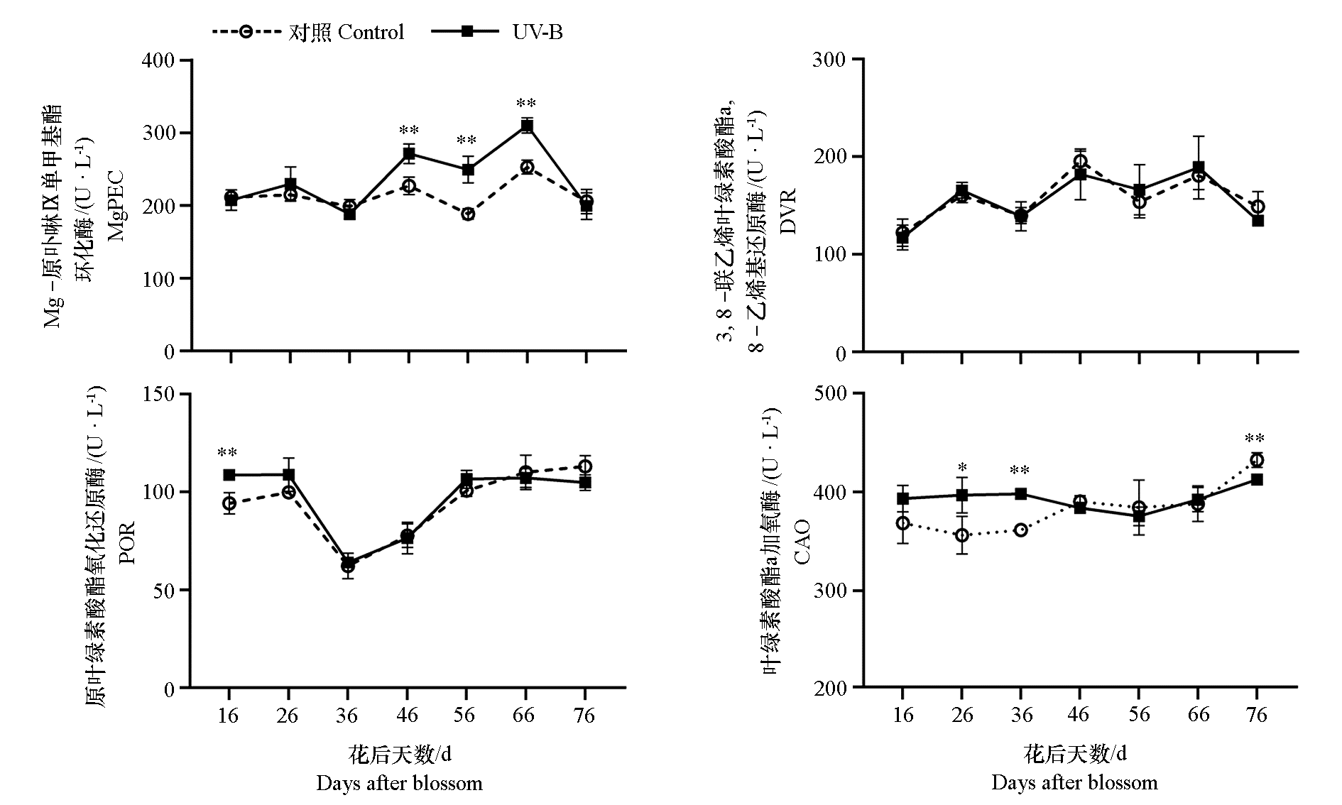 为明晰桃叶片叶绿素生物合成过程中对紫外线B(Ultraviolet B,UV-B)辐照响应的关键步骤,以设施栽培的‘中油5号’油桃(Prunus persica var. nectariana)7年生树为试材,自花后7 d开始,每天8:30—9:30补充适宜剂量(由前期试验筛出,约1.44 kJ · m-2 · d-1)的UV-B直至果实采收,以正常生长、未补充UV-B辐照的植株为对照,对生育期内叶片叶绿素生物合成过程中前体物质、中间产物和叶绿素含量以及关键酶活性的动态变化进行了探究。结果表明,在叶绿素合成第一阶段中,UV-B辐照通过提升前体物质δ-氨基酮戊酸(ALA)合成关键酶——谷氨酸酯-1-半醛 2,1-氨基变位酶(GSA-AM)的活性,增加了ALA的积累量,为生物合成的开始奠定物质基础。在第二阶段中,UV-B提高了胆色素原脱氨酶(PBGD)的活性,促进了羟甲基胆色素原的合成,为后续产物尿卟啉原Ⅲ(Urogen Ⅲ)的合成提供底物,使得整个生育期内叶片中粪卟啉原Ⅲ(Coprogen Ⅲ)和原卟啉Ⅸ(Proto Ⅸ)的含量显著提升。UV-B辐照后第三阶段的Mg-螯合酶(MgCH)和Mg-原卟啉Ⅸ单甲基酯环化酶(MgPEC)等关键酶的活性显著升高,各中间产物Mg-原卟啉Ⅸ(MgP Ⅸ)、Mg-原卟啉Ⅸ甲酯(MgPME)、联乙烯原叶绿素酸酯、原叶绿素酸酯(Pchlide)、叶绿素酸酯a(Chlide a)、叶绿素酸酯b(Chlide b)含量均得到提升,最后产物叶绿素的含量也显著高于对照。可见UV-B辐照影响叶绿素生物合成的主要关键步骤为前体物质ALA的合成、羟甲基胆色素原的合成、Urogen Ⅲ向Coprogen Ⅲ的转化、Mg2+插入Proto Ⅸ及其后等4个步骤,且对叶绿素生物合成的影响具有长期积累性。