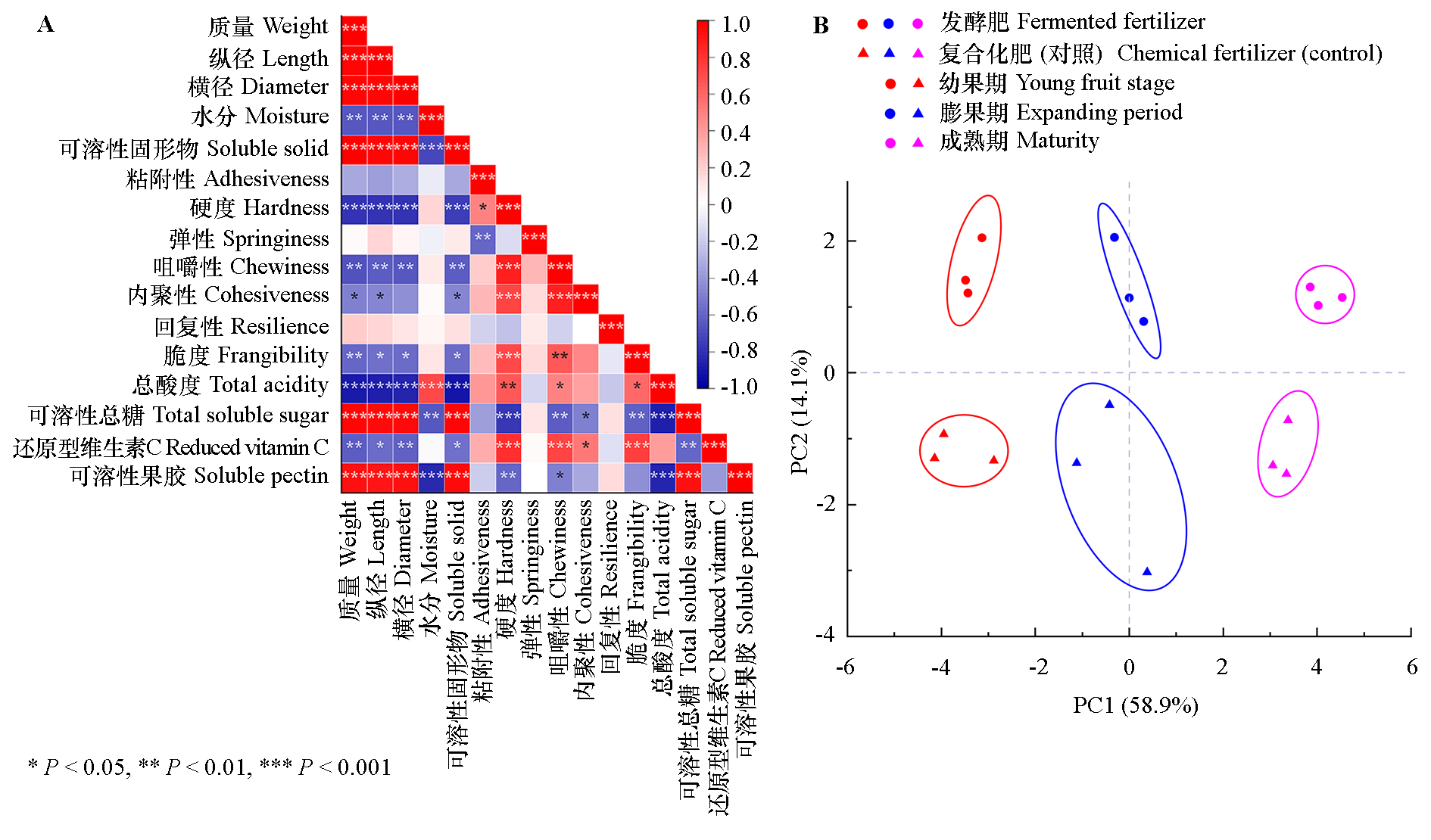 为提升食品工业副产物的产业附加值,提升资源利用率,同时减量使用化肥,推动绿色农业高质量发展,以鱼下角料、花生粕和豆渣为底料,有益微生物群(effective microorganisms,EM)为菌种,采用响应面法优化工艺,制备发酵液体有机肥(以下简称发酵肥),喷施于‘鹰嘴蜜桃’叶面,以施用复合化肥(NP2O5K2O = 151515)为对照,探究对果实品质的影响。结果表明:制备发酵肥的最优参数为EM菌接种量4.6%、料液比12.6、发酵时间11 d,该条件下发酵肥的氨基酸态氮含量达到(5.64 ± 0.13) g · L-1。施用发酵肥的成熟期果实的质量、可溶性固形物、可溶性果胶、可溶性总糖、还原型维生素C含量和硬度均显著高于对照,分别高14.43%、9.66%、24.42%、8.96%、11.72%和19.55%,表明施发酵肥的果实品质更优,商品价值更高。通过低场核磁共振和Pearson相关性分析发现,随着果实生长成熟,发酵肥处理的果实内部水分自由度增强,更有利于新陈代谢与生长发育;同时果实中水分含量逐渐下降,水分含量与可溶性糖、可溶性果胶等营养成分呈极显著负相关。本研究结果表明,利用食品工业副产物制备的发酵肥能够有效提升‘鹰嘴蜜桃’的整体品质,为食品废弃资源的高值化利用提供了科学依据和理论基础。