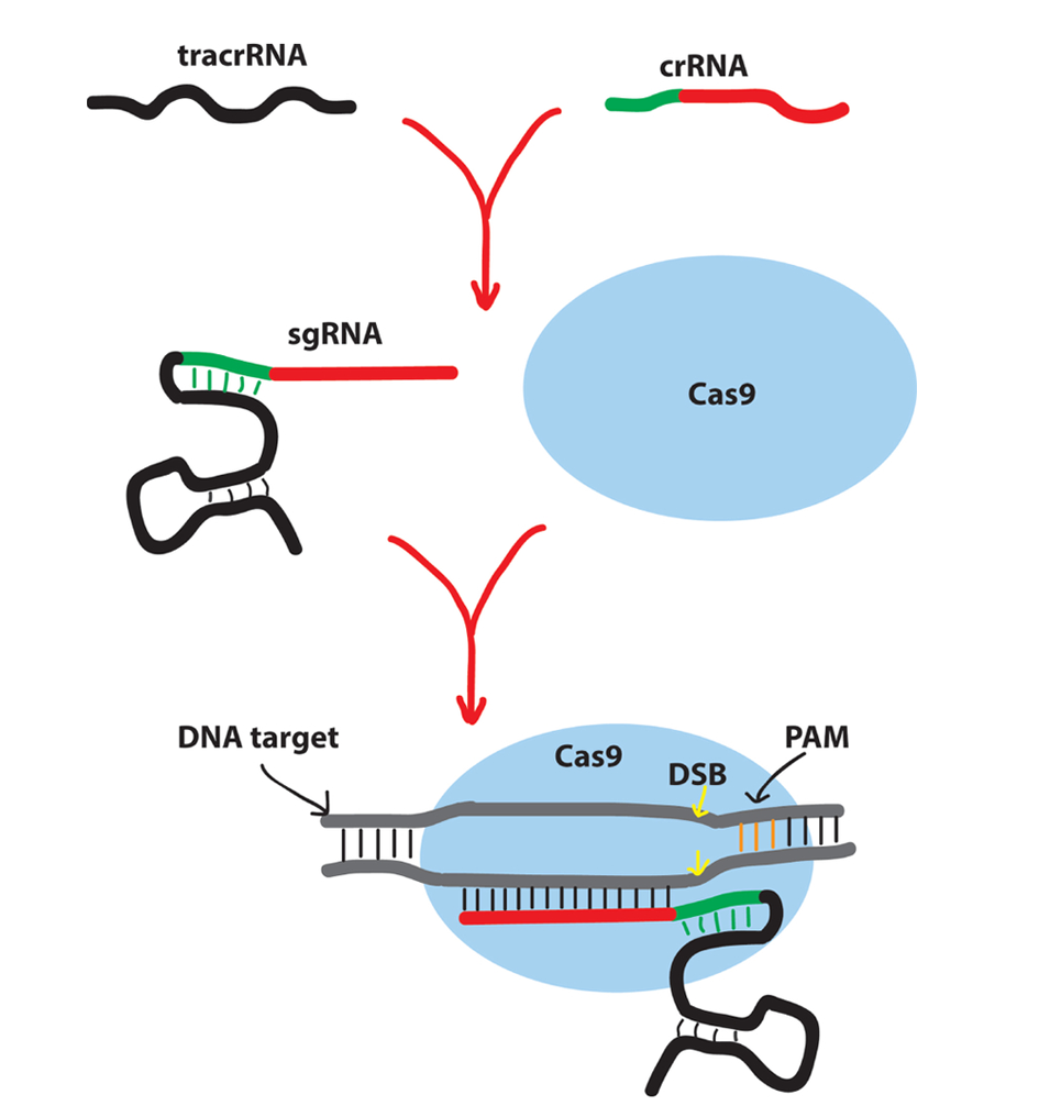 Fig. 1 Principle of CRISPR/Cas9 system operation tracrRNA:trans-Activating crRNA;sgRNA:Single guide RNA;DNA target:Targeting DNA;DSB:Double strand break;PAM:Protospacer adjacent aotif.(Zhou et al.,2020)