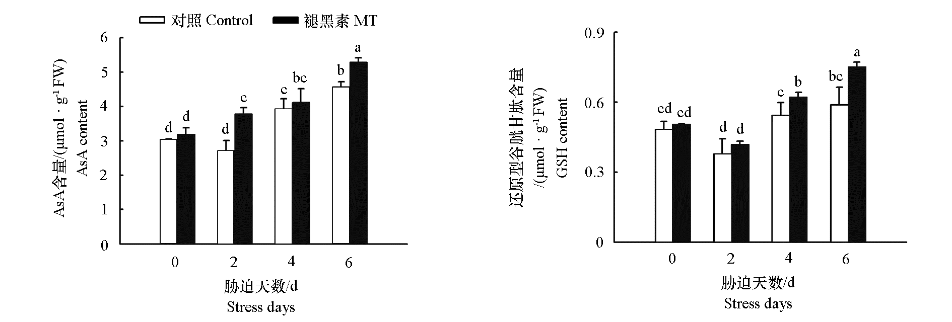图1 外源褪黑素(MT)对黑暗条件下番茄叶片SAG12表达量的影响 不同小写字母表示差异显著(P < 0.05)。下同。