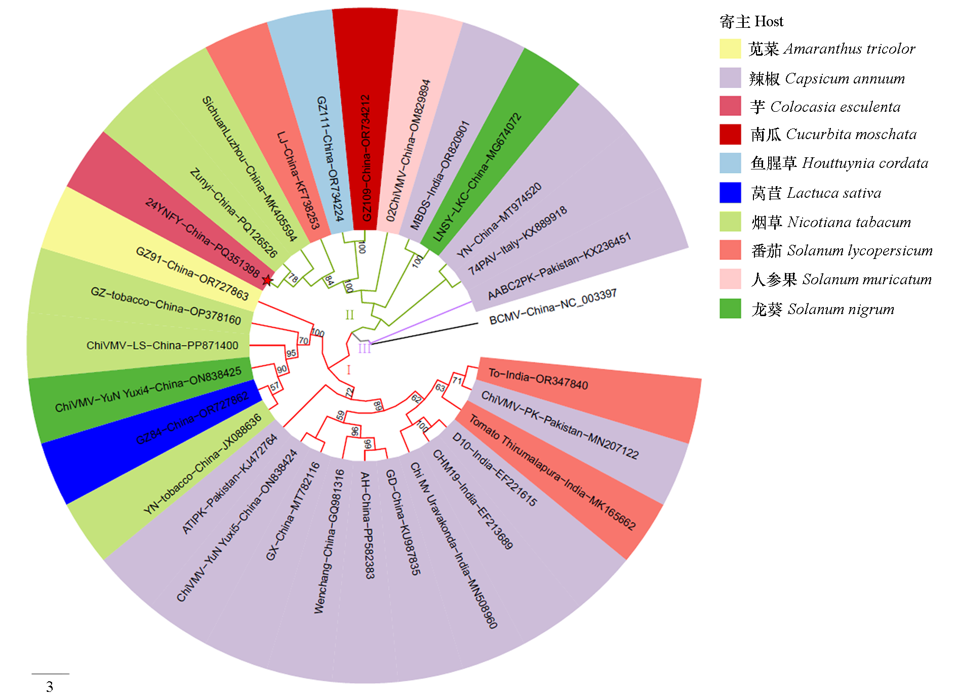 Fig. 3 Phylogenetic tree based on the sequence of CP gene from chilli veinal mottle virus and its related isolates Ⅰ,Ⅱ and Ⅲ are groups;The CP gene sequence of BCMV is outgroup;★ Isolate obtained in this study;Isolates in the phylogenetic tree are expressed in the form of isolate-source-accession No.