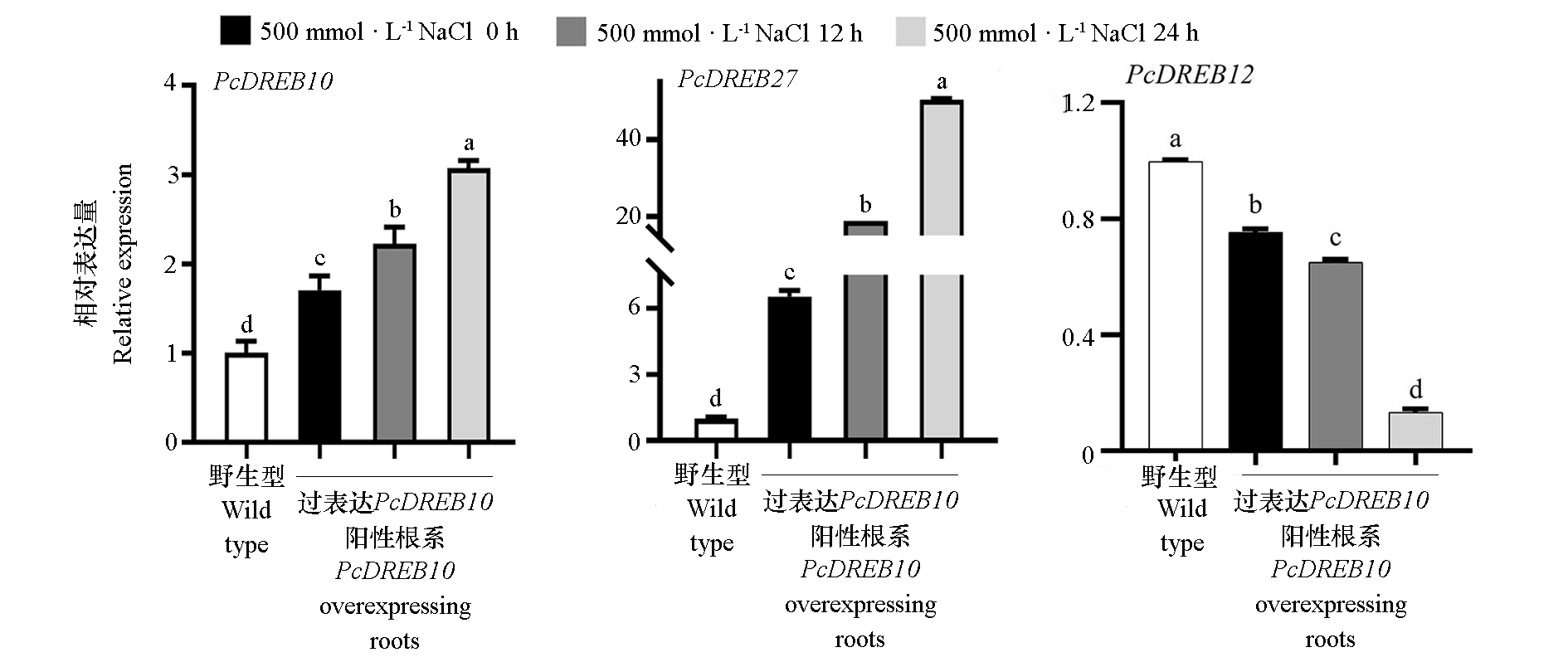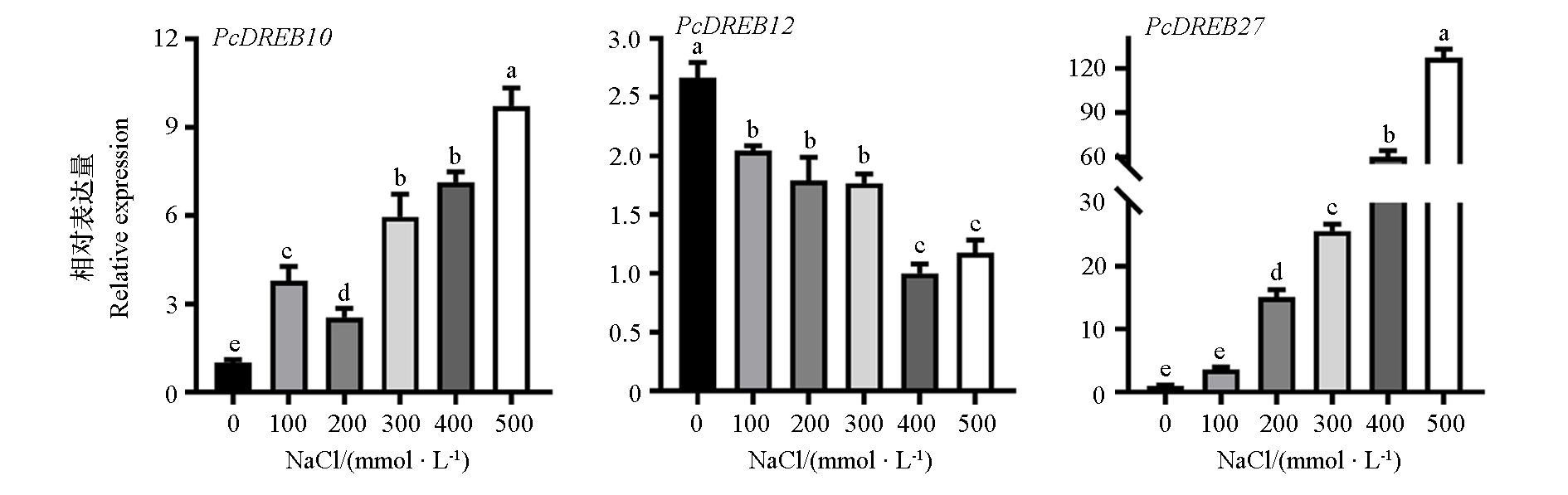 图6 PcDREB家族成员在不同浓度NaCl处理48 h后的表达分析 不同小写字母代表 0.05 水平差异显著