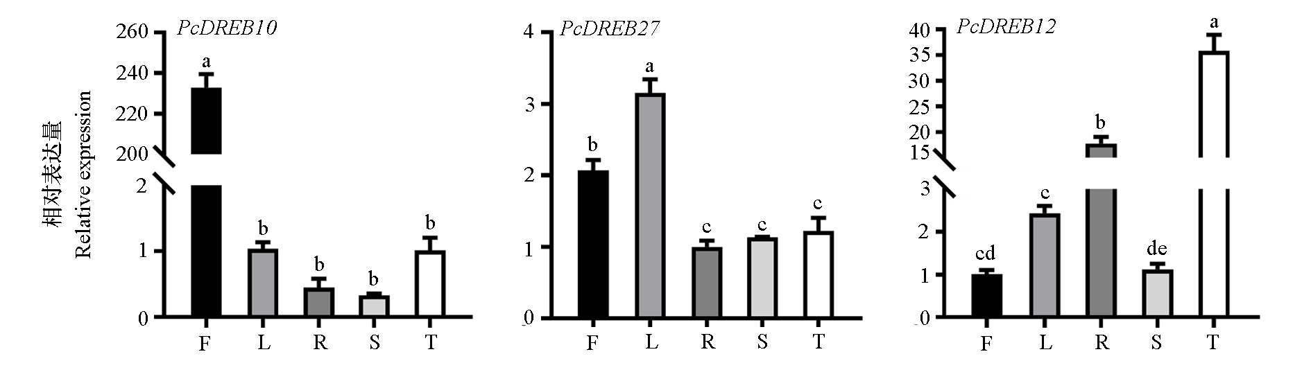 图5 PcDREB家族成员在不同器官中的表达分析 图中小写字母代表 0.05 水平差异显著