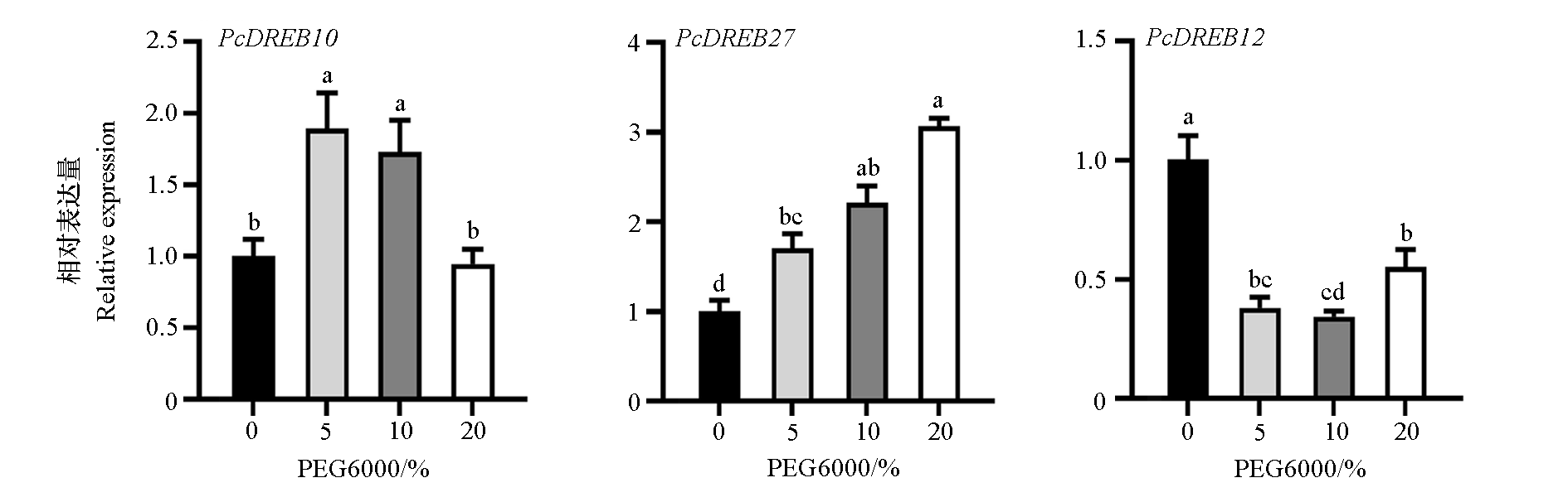 图7 PcDREB家族成员在不同浓度PEG6000处理72 h后的表达分析 不同小写字母代表 0.05 水平差异显著