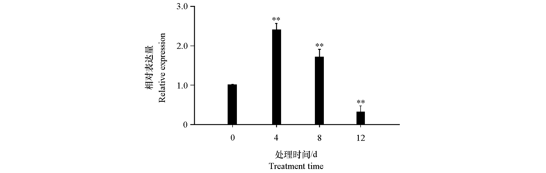 图2 低温处理下‘怀枝’荔枝中LcICE1的表达 ** 表示与处理前(0 d)有显著差异(P < 0.01)