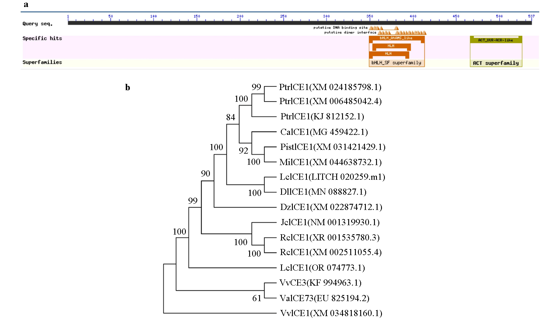 Fig. 3 Conservative structure domain(a)and system evolution tree construction(b)of LcICE1 Ptr:Poncirus trifoliata;Ca:Capsicum annuum;Pist:Pistacia vera;Mi:Mangifera indica;Dl:Dimocarpus longan;Dz:Durio zibethinus;Jc:Juglans cathayensis;Rc:Racomitrium canescens;Vv:Vitis vinifera;Va:Vitis amurensis