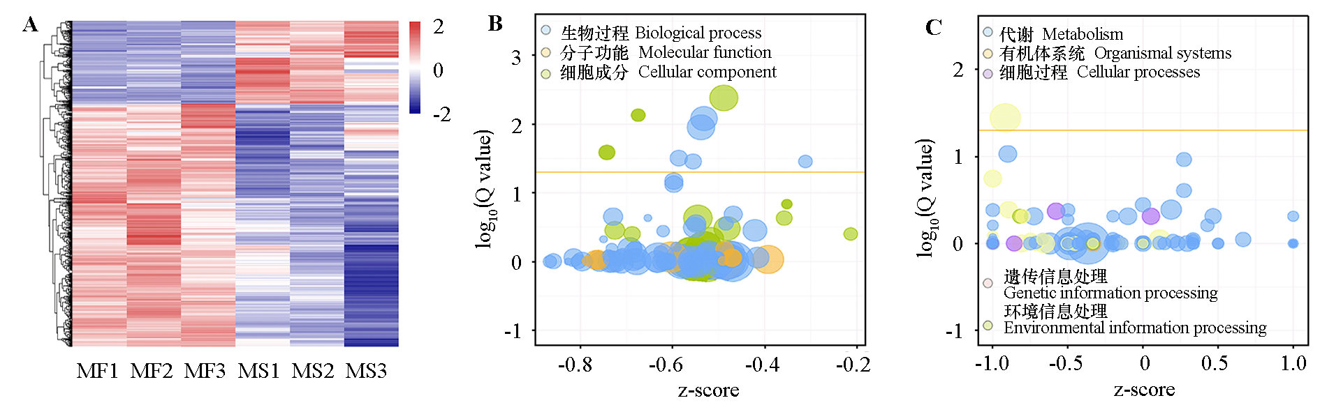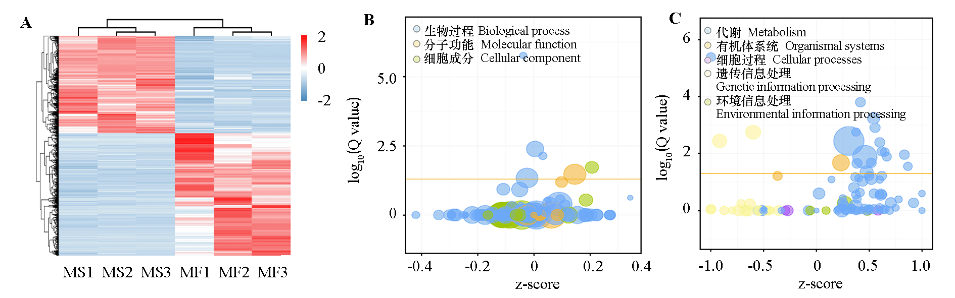 Fig. 3 Proteome analysis of Wucai flower buds in sterile and fertile plants at the tetrad stage A:Heatmap of DEP(MS:male sterile;MF:male fertile);B:GO enrichment analysis of DEP;C:KEGG enrichment analysis of DEP