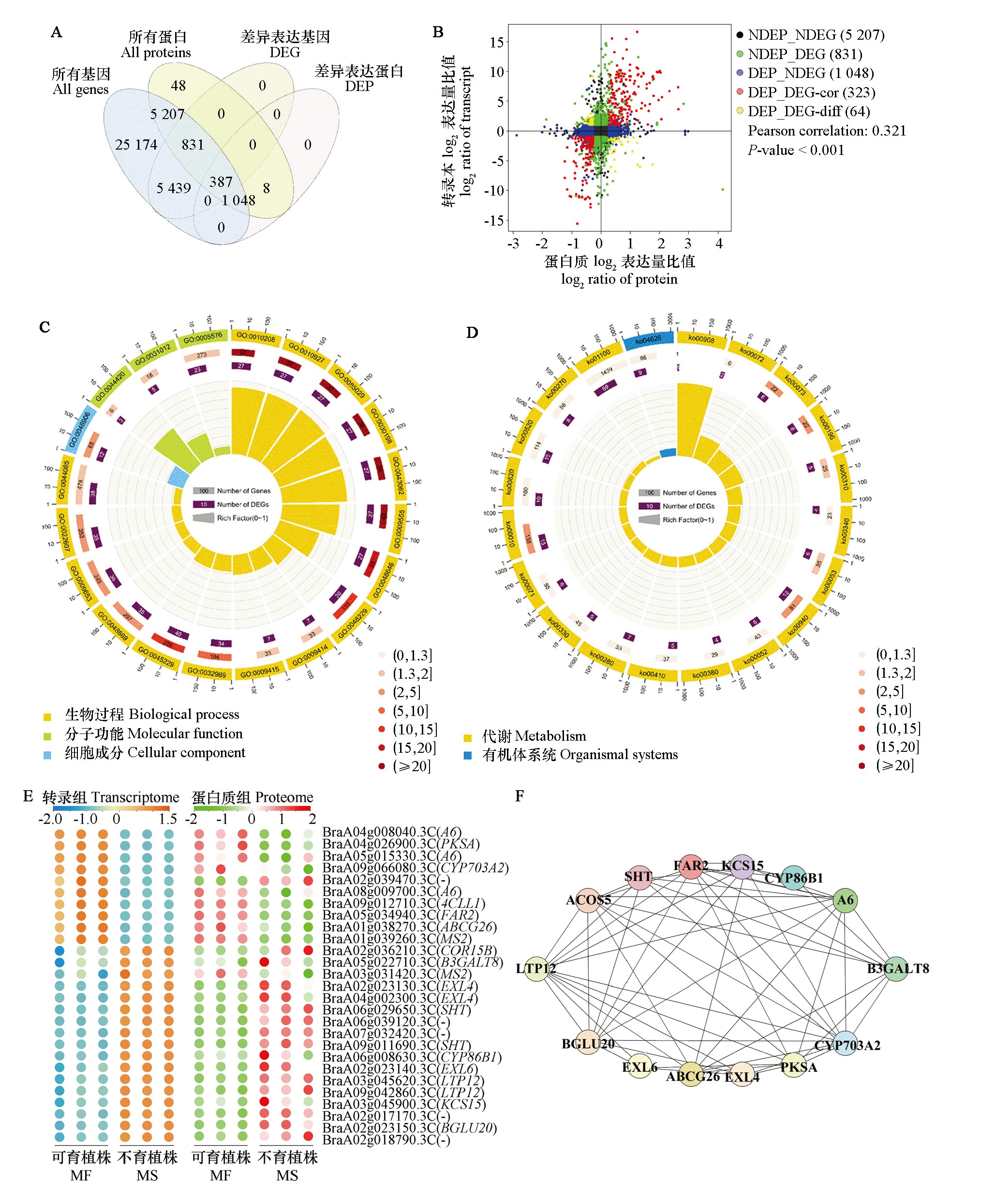 图4 乌塌菜转录组与蛋白质组联合分析 A:差异表达基因与差异表达蛋白Venn图;B:四象限图,共鉴定出2 266个可定量到的蛋白-mRNA对,NDEP表示蛋白水平不差异,NDEG表示转录水平不差异;C:GO富集分析mRNA与蛋白关联基因对;D:KEGG富集分析mRNA与蛋白关联基因对;E:花粉发育发育通路相关基因表达分析;F:花粉发育发育通路相关基因PPI网络图