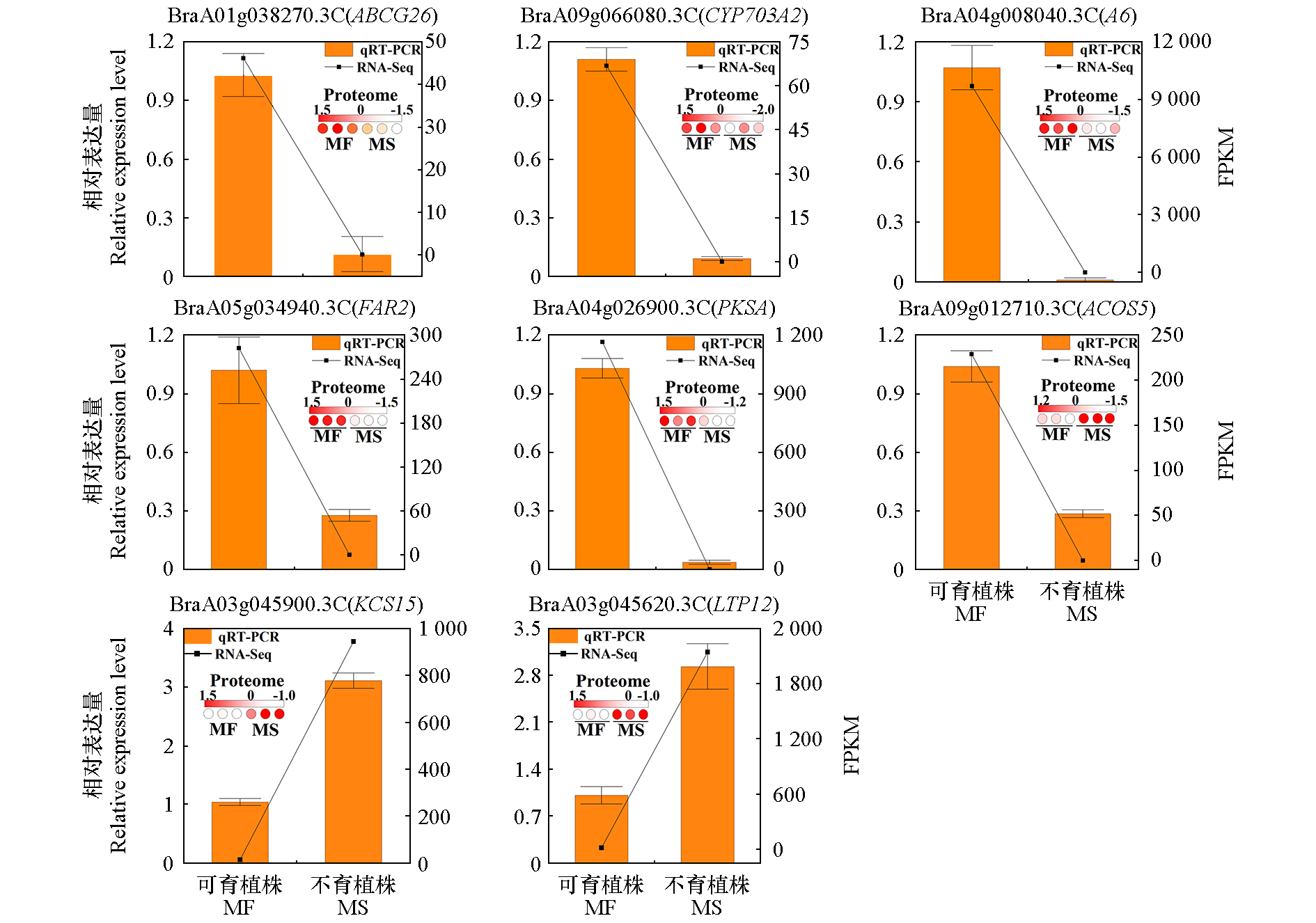 以乌塌菜(Brassica campestris L.)可育系和细胞质雄性不育系植株为试材,利用转录组学与蛋白质组学分析,共鉴定出6 657个差异表达基因(DEG)和1 443个差异表达蛋白(DEP),主要富集在以下过程/通路中:花粉发育(GO:0009555)和花粉壁组装(GO:0010208)等生物过程,以及苯丙素生物合成(ko00940)、角质、木栓质和蜡质生物合成(ko00073)等代谢途径。通过联合分析,发现转录组与蛋白组之间呈现正相关,共有387个mRNA与蛋白关联在转录水平和蛋白丰度上均表现出显著差异。对富集在花粉发育与花粉壁组装生物过程中的蛋白进行蛋白—蛋白互作(PPI)网络分析,发现BraA05g034940.3C(FAR2)等蛋白与其他蛋白关联较强。BcFAR2在花蕾组织中,尤其是花药发育的四分体与单核期表达量较高,并且过表达BcFAR2可恢复拟南芥far2突变体的花粉育性。