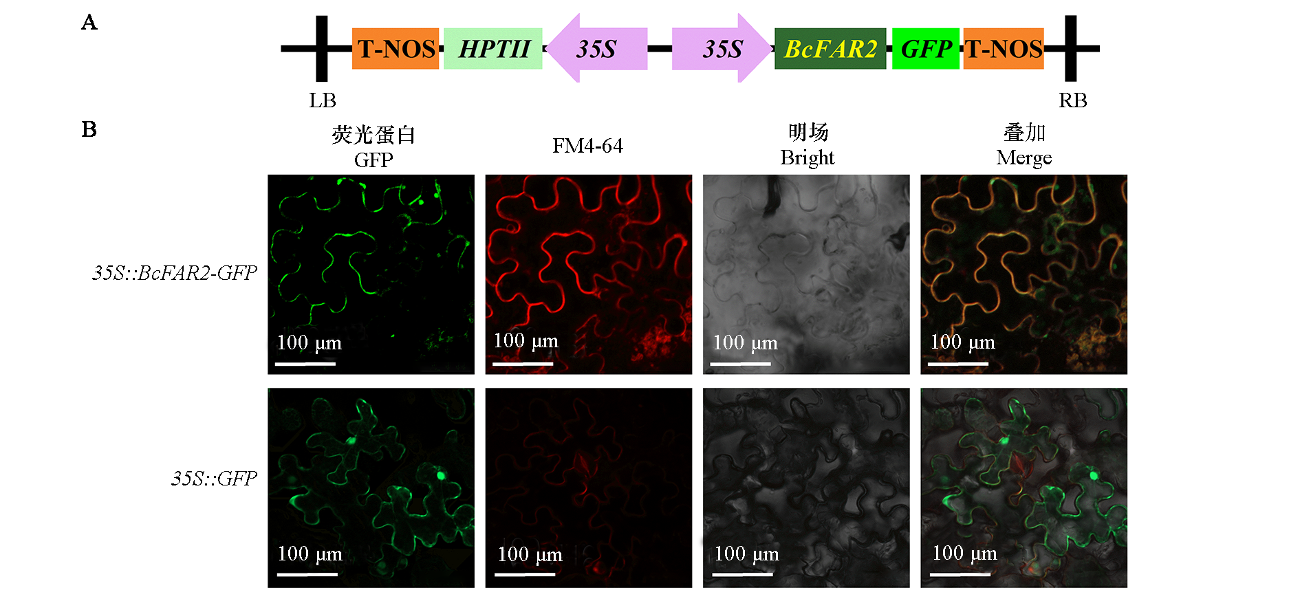 图7 乌塌菜BcFAR2亚细胞定位分析 A:亚细胞定位载体;B:亚细胞定位
