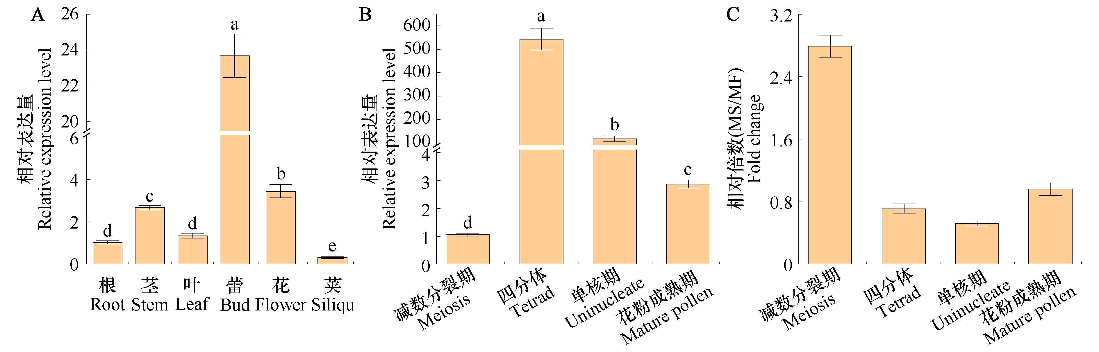 图8 乌塌菜BcFAR2基因表达分析 A:BcFAR2在乌塌菜各组织中的相对表达量;B:BcFAR2在乌塌菜可育植株不同花药发育时期中的表达量;C:乌塌菜不育植株中BcFAR2在不同花药发育时期相对可育植株的表达量。柱上不同小写字母表示Duncan’s多重检验在P < 0.05水平上差异显著