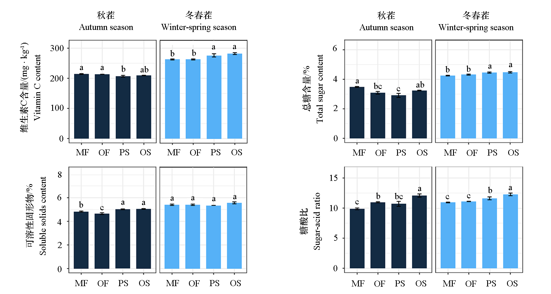 图1 不同栽培处理对番茄果实品质和产量的影响 MF、OF、PS、OS分别代表施用化肥、施用有机肥、采用草炭基质及菌糠堆腐基质的栽培方式。不同小写字母代表不同处理间差异显著(P < 0.05)。下同