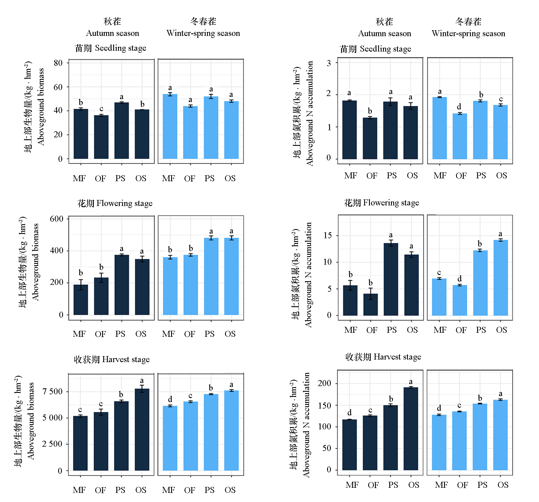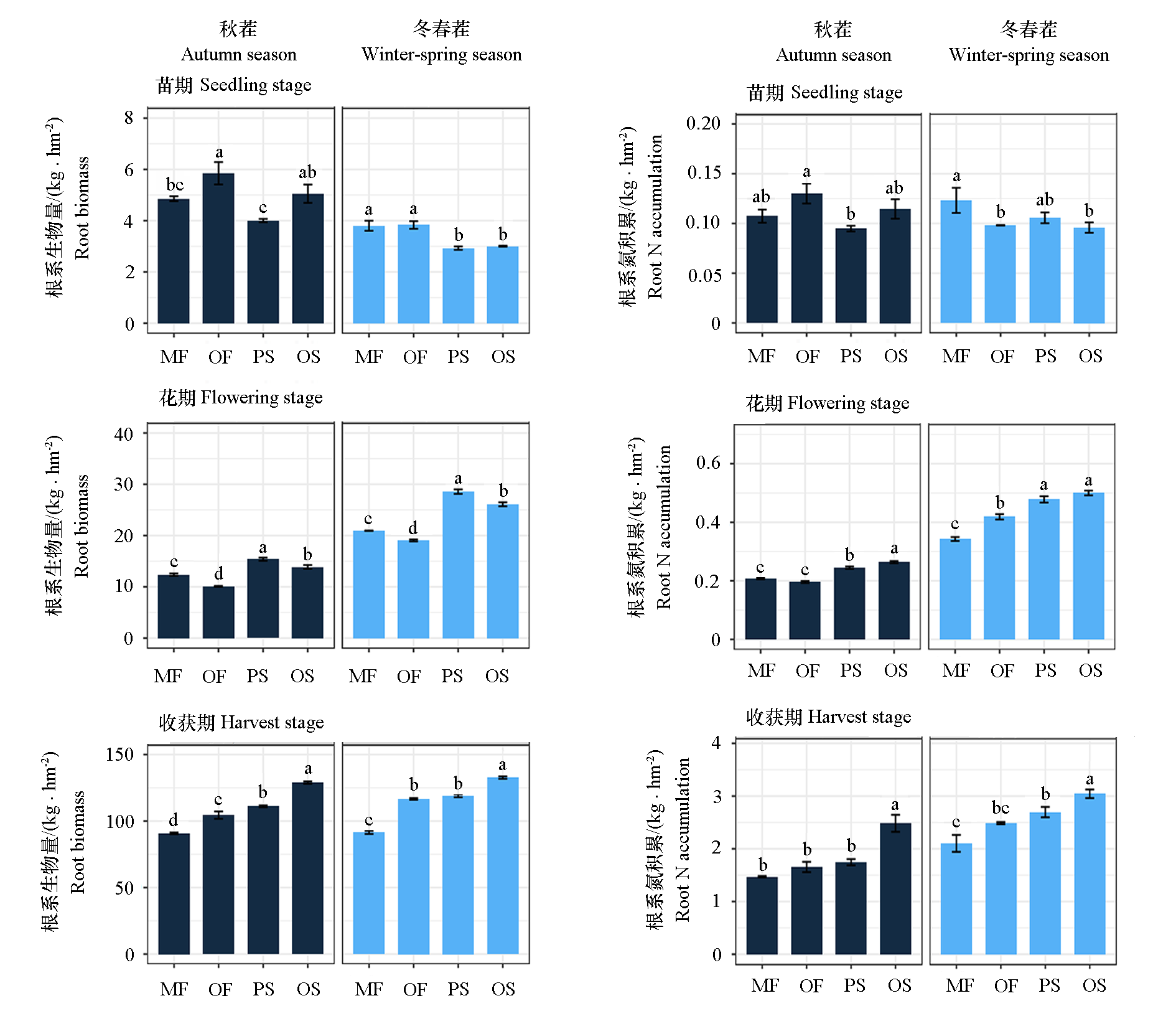 | 秋茬 Autumn season | 苗期 Seedling stage | MF | 14.47 ± 1.03 a | 167.81 ± 1.44 ab | 0.414 ± 0.022 a | 1.61 ± 0.10 a | 149.97 ± 9.23 a |