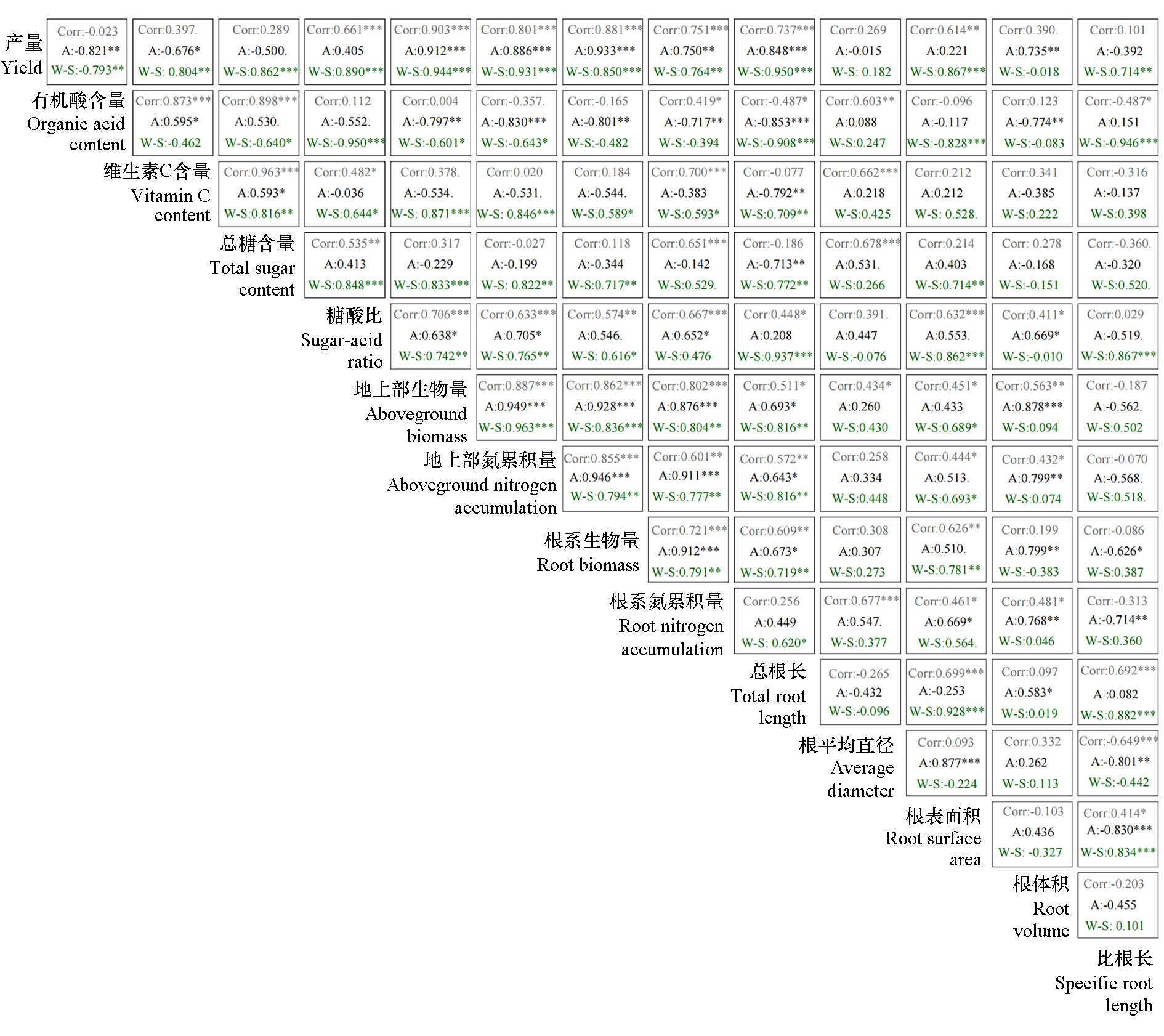 图4 番茄氮素吸收与生长及品质指标的相关性分析 A:秋茬;W-S:冬春茬。*、**和***分别表示在0.05、0.01和0.001水平显著相关
