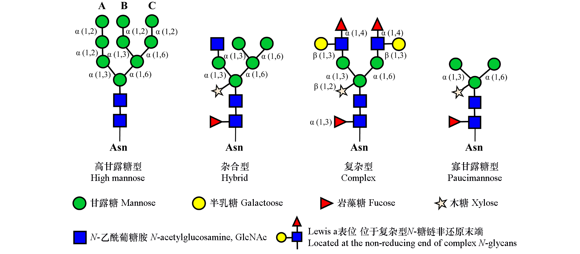 总结了植物蛋白质N-糖基化修饰相关的N-糖链结构特征及其加工途径,重点梳理了参与N-糖基化修饰的关键酶,包括寡糖转移酶(oligosaccharyltransferase,OST)、α-葡萄糖苷酶(α-glucosidase,GCS)、α-甘露糖苷酶(α-mannosidase,α-Man)及其他N-糖链加工酶的酶学特性与生物学功能研究进展。