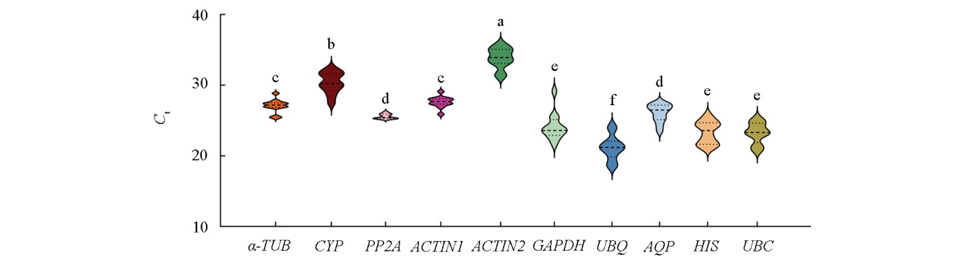 图4 候选内参基因在所有样品中的Ct值分布 使用Duncan’s新复极差法进行显著性分析,不同小写字母表示差异显著(P < 0.05)