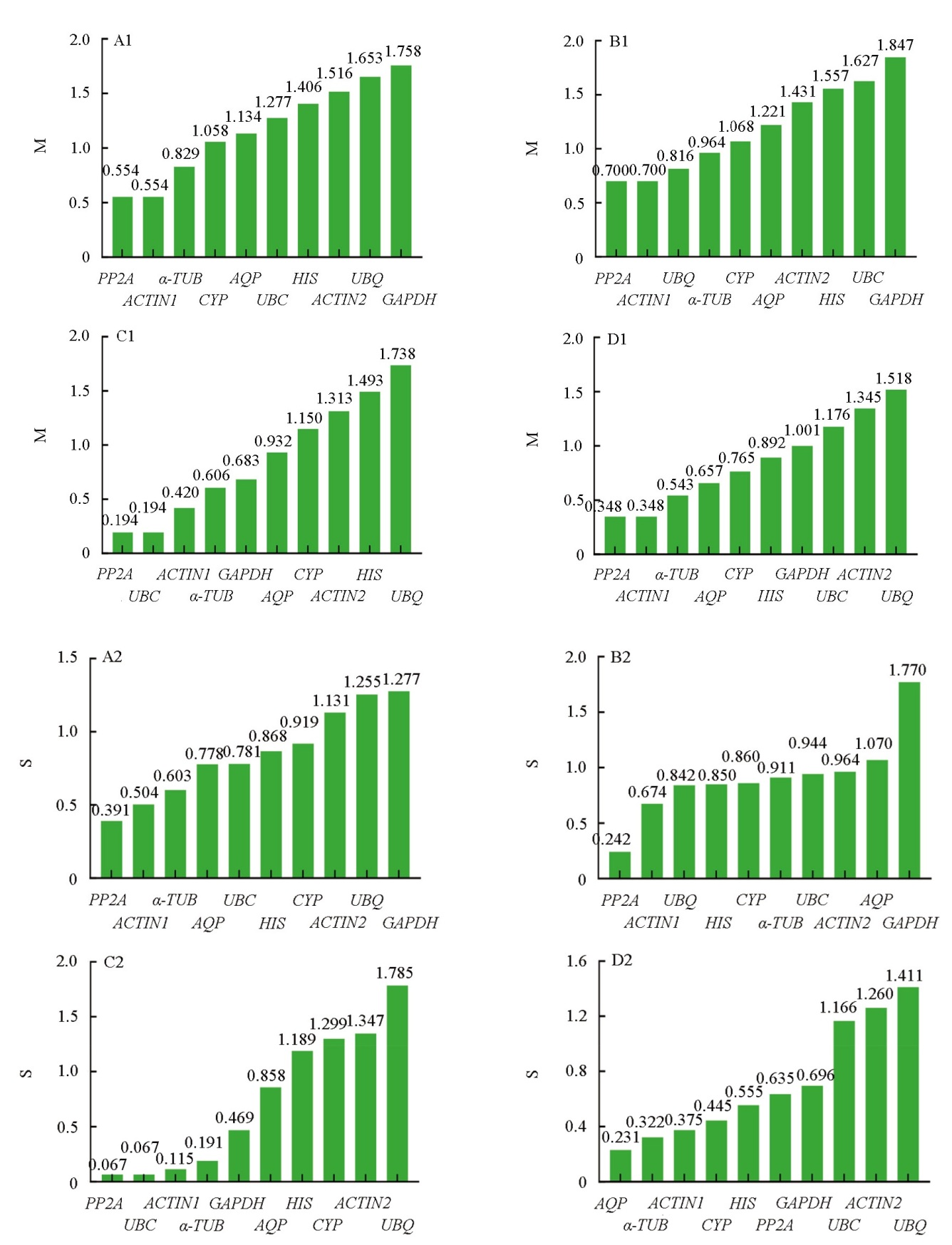 图5 geNorm(A1 ~ D1,M)和NormFinder(A2 ~ D2,S)分析候选内参基因的表达稳定值 A:所有样品;B:组织;C:开花阶段;D:不同香型品种