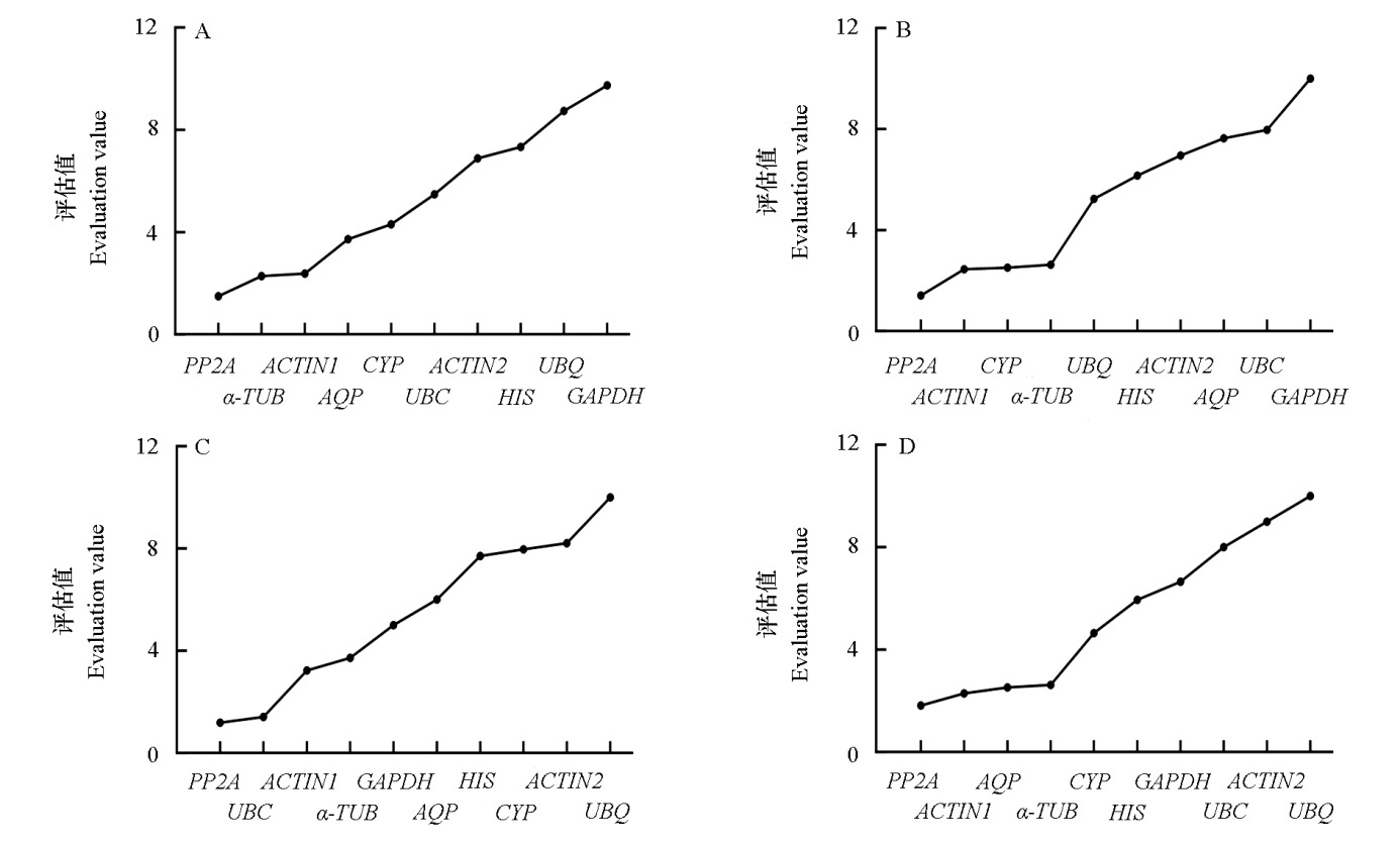 Fig. 6 The comprehensive stability ranking of 10 candidate reference genes A:All samples;B:Tissue;C:Flowering stage;D:Different fragrance cultivars