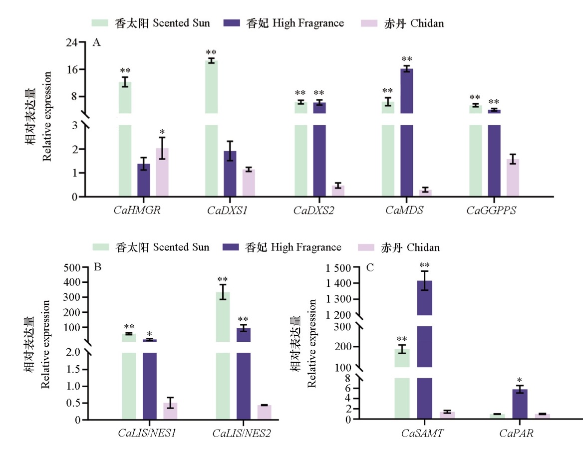 Fig. 8 The relative expression level of floral scent-synthesizing genes using PP2A as reference gene A-C are the structural genes involved in precursor pathway for monoterpene synthesis,the key enzyme genes in the terpenoid synthesis pathway and benzenering/phenylpropanoid compound synthesis pathway,respectively. t-test,* P < 0.05,** P < 0.01