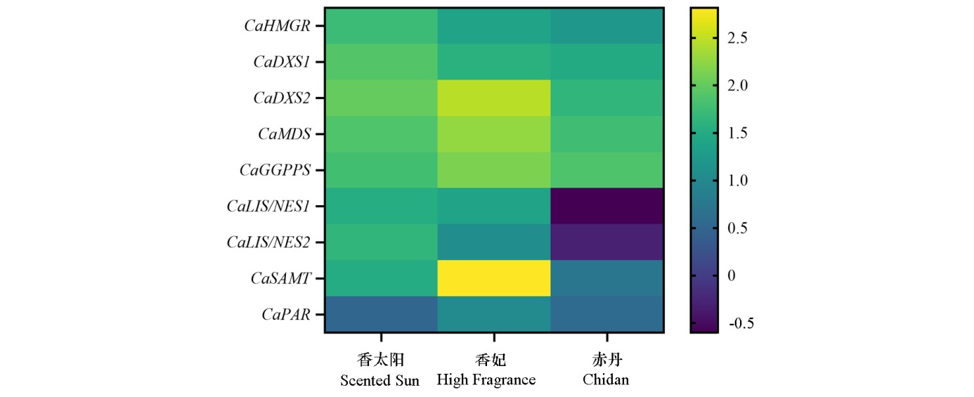 Fig. 9 The expression patterns of nine key floral scent-synthesizing genes in different fragrance cultivars at peak flowering stage