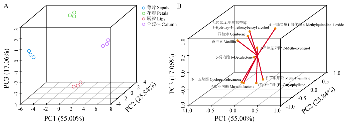 Fig. 1 Three-dimensional principal component analysis(A)of floral organs in Maxillaria tenuifolia and loading distribution of the TOP10 volatile organic compounds(B)