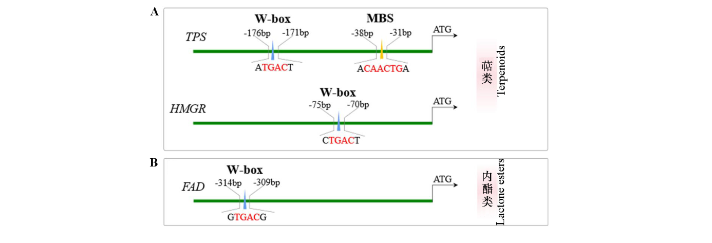 图10 腋唇兰花香气关键基因的调控模式 A:萜类化合物合成关键基因TPS与HMGR启动子中的WRKY结合位点(W-box)及MYB结合位点(MBS)分布;B:内酯类化合物合成关键基因FAD启动子中的WRKY结合位点(W-box)分布
