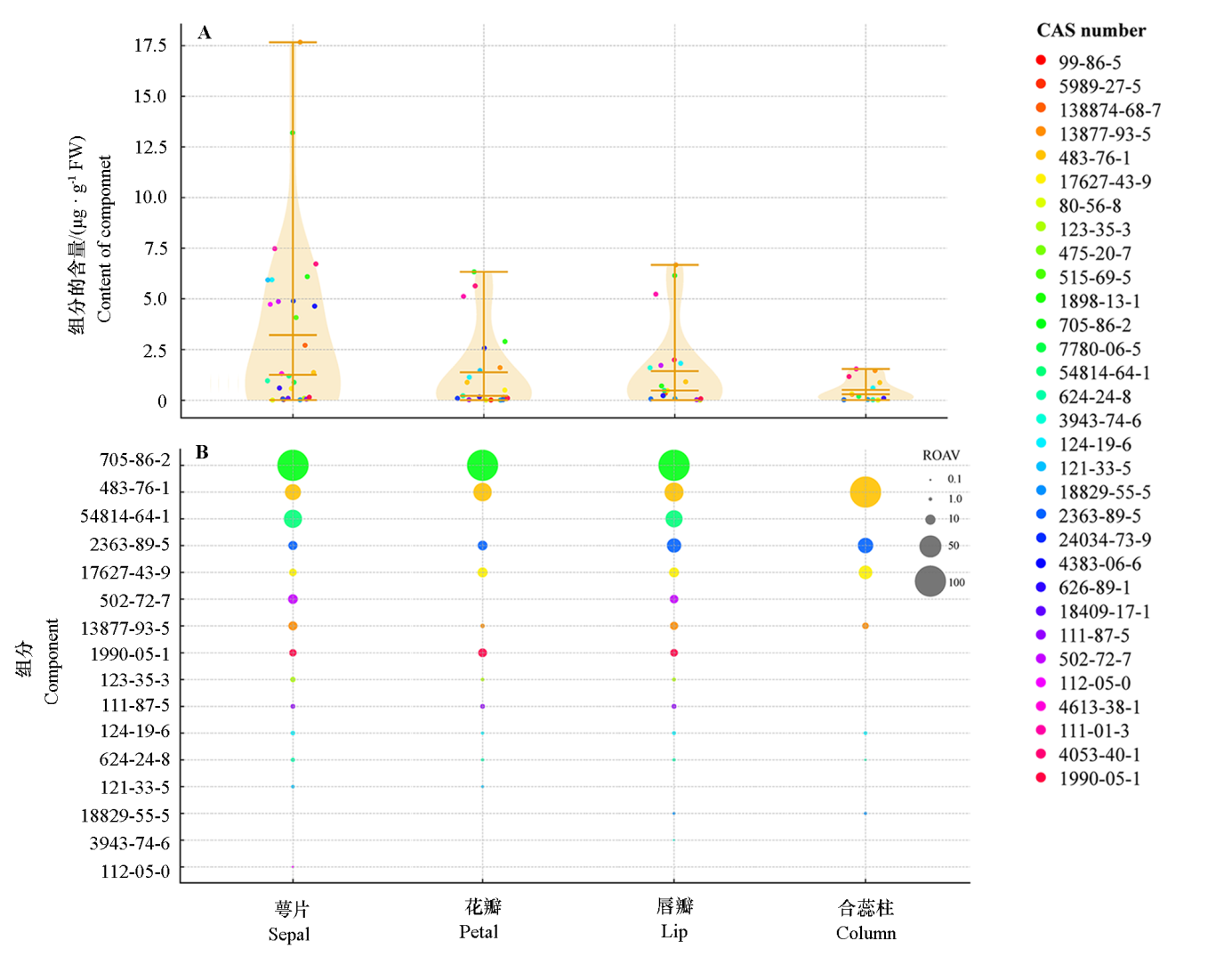 图2 腋唇兰4个花器官VOC含量与ROAV分布 A:基于半定量结果绘制的小提琴图;每个散点代表一种 VOC。B:ROAV气泡图,仅显示 ROAV ≥ 0.1,每个气泡代表一种VOC