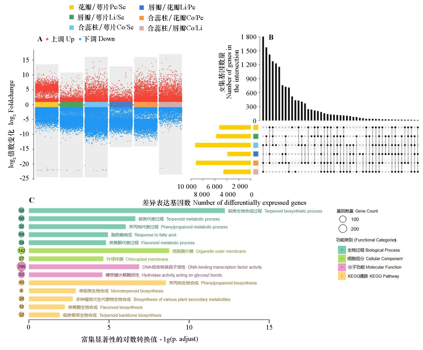 Fig. 3 Transcriptome analysis of four tissue parts of floral organs in Maxillaria tenuifolia A:Volcano plots of differentially expressed genes(DEGs)for pairwise comparisons between tissue parts;B:Upset diagram of DEGs;C:GO and KEGG enrichment analysis of DEGs. Pe:Petal;Li:Lip;Se:Sepal;Co:Column
