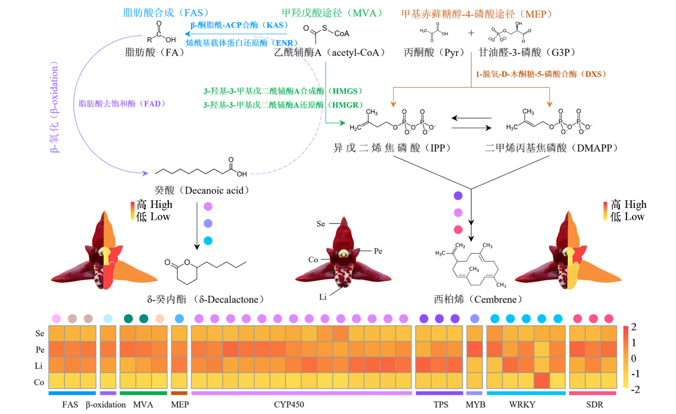 图9 脂肪酸合成途径(FAS)、甲羟戊酸途径(MVA)和甲基赤藓糖醇-4-磷酸途径(MEP)在腋唇兰花器官中合成酯类和萜类化合物的示意图 紫色箭头表示β-氧化循环;蓝色和绿色字体表示FAS和MVA途径中的关键酶基因,橙色字体表示MEP途径的关键酶。下方热图展示了这些基因在不同花器官中的转录表达水平(黄色至红色表示从低到高)。中央花瓣图像展示了δ-癸内酯和西柏烯在不同花器官中的相对丰度差异。Pe:花瓣;Li:唇瓣;Se:萼片;Co:合蕊柱
