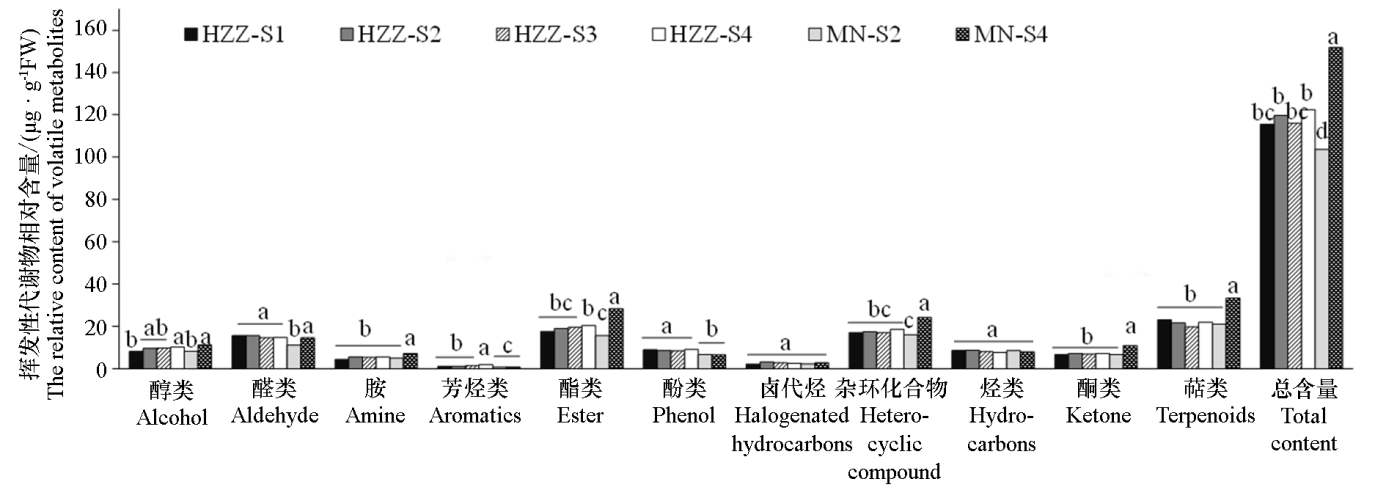 图3 两种秋石斛不同花期花朵各类挥发性代谢物相对含量 HZZ:‘红珍珠’;MN:‘迷你’。不同小写字母表示多重比较Duncan’s 检验在0.05水平下差异显著。下同