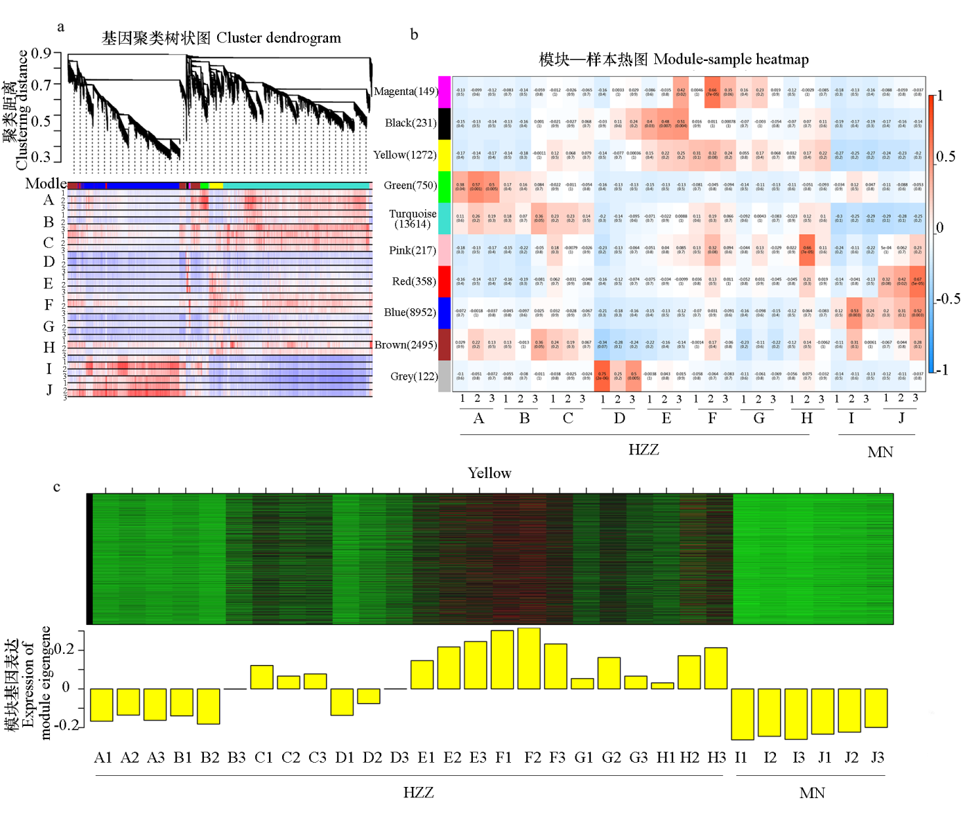 图6 WGCNA分析 a:基因聚类树状图(上)、模块颜色条(中)及划分的基因共表达模块(下);b:模块—样本关联热图;c:黄色模块基因表达模式热图(上,绿、红色分别代表低、高表达)和模块特征基因(ME)柱状图(下)。A1 ~ A3:小花蕾期花朵;B1 ~ B3和I1 ~ I3:大花蕾期花朵;C1 ~ C3:初开期花朵;D1 ~ D3;盛开期合蕊柱;E1 ~ E3:盛开期唇瓣;F1 ~ F3:盛开期花瓣;G1 ~ G3:盛开期萼片;H1 ~ H3和J1 ~ J3:盛花期花朵